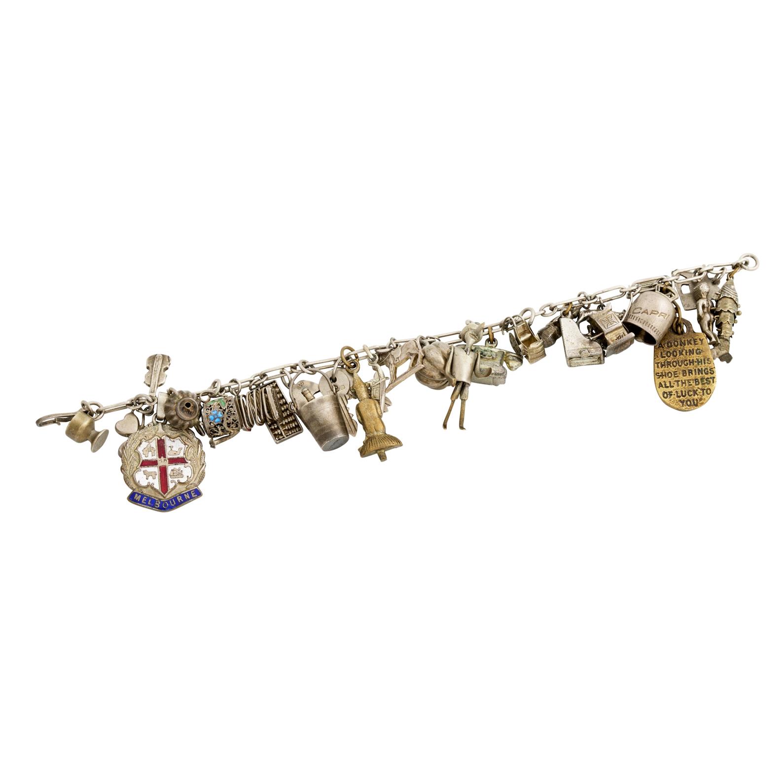 Composed of an assortment of enamelled and silver charms, some in base metal, length 205mm, gross weight approximately 63.6 grams.