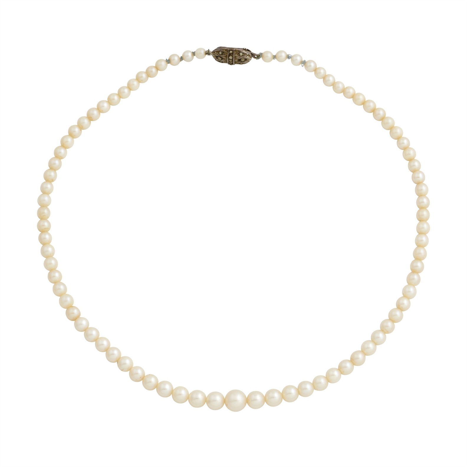Composed of a graduating line of cultured pearls, completed by a silver tongue and groove clasp, inner circumference 445mm, gross weight approximately 20.1 grams.