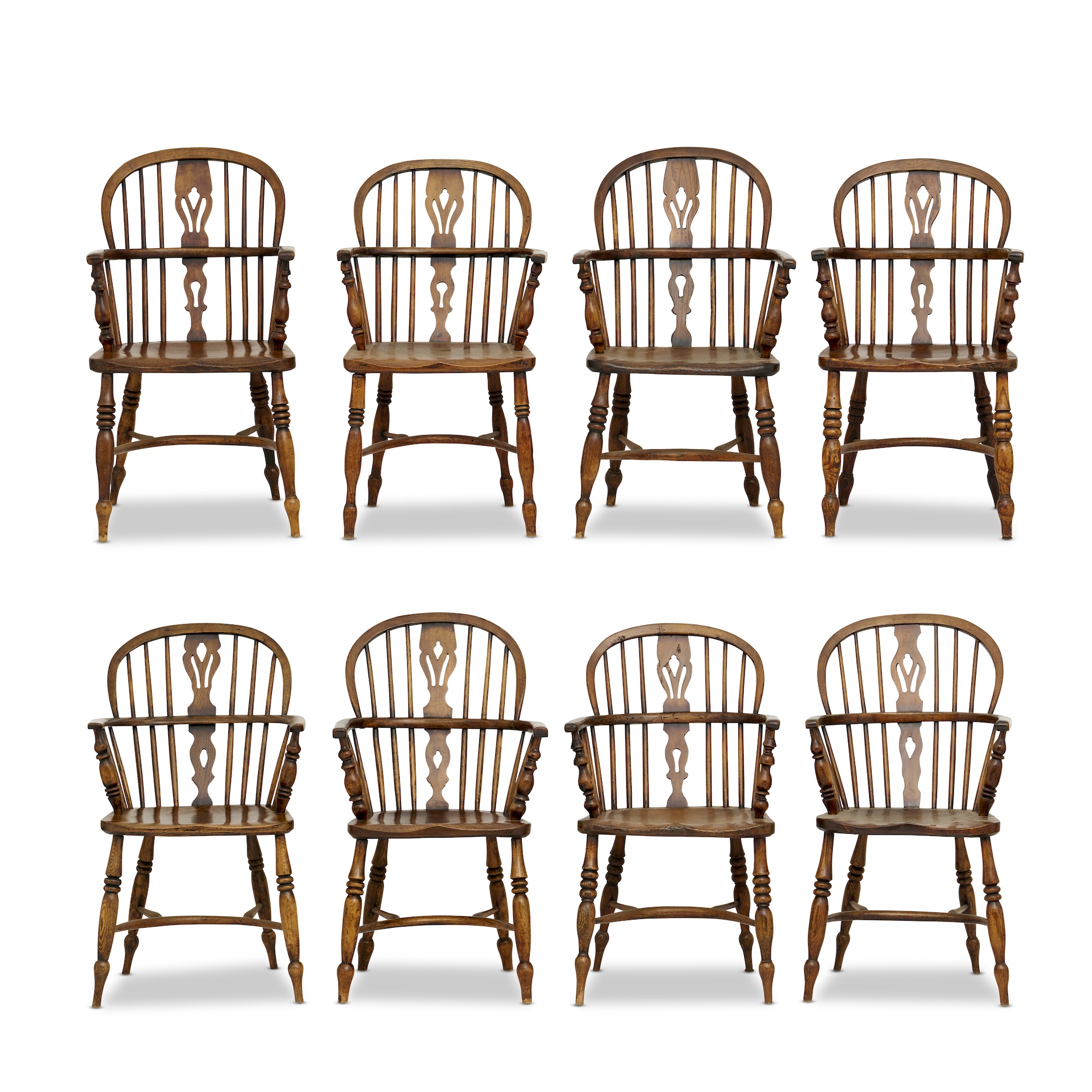 One seat has an old shrinkage crack (filled and stable); one chair has an old repaired fracture to its arm bow at is intersection with its back bow (stable, with no movement); and two chairs have scattered old wormholes to the undersides of their seats (with no further depredation).