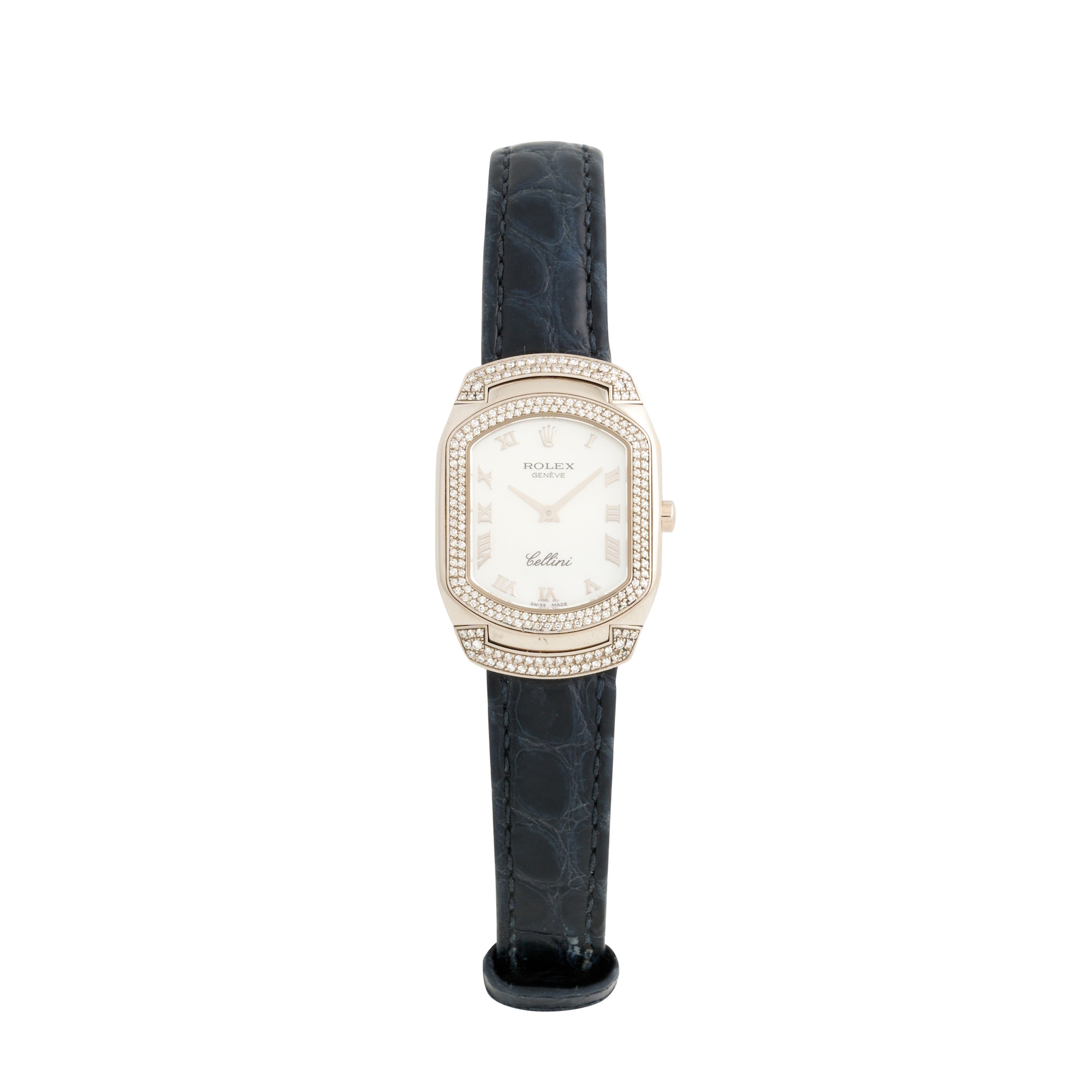 Case: brushed and polished rectangular case with diamond-set bezel, diamond set hooded lugs, snap on case back no. K666744