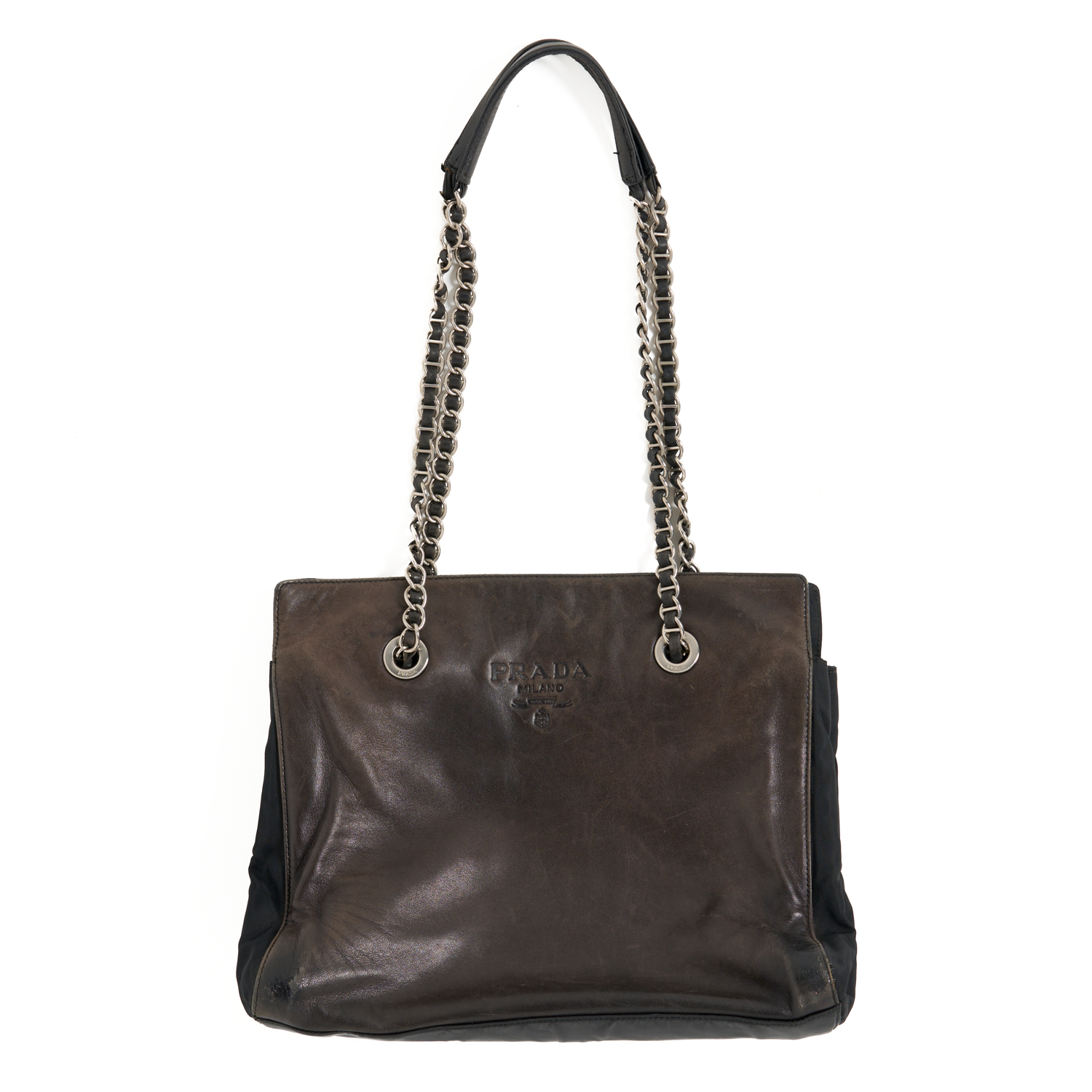 PRADA, A HANDBAG STYLED IN BLACK NYLON AND BROWN LEATHER, WITH SILVER METAL HARDWARE AND BLACK LEATHER WOVEN CHAIN STRAP, EMBOSSED PRADA LOGO TO FRONT, 26 X 32 X 9CM
