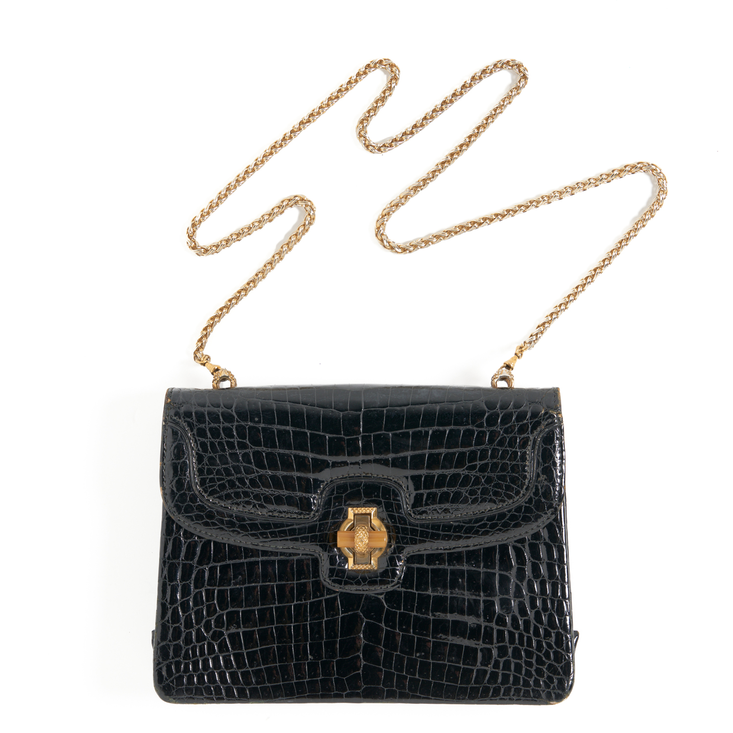 GUCCI, A SHOULDER BAG STYLED IN BLACK CROCODILE EMBOSSED LEATHER WITH GOLD METAL TONE HARDWARE, CHAIN STRAP AND FEATURE TOGGLE CLASP, 16 X 22 X 7CM