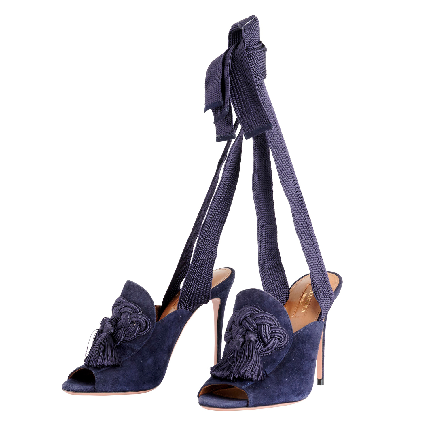 AQUAZZURA, A PAIR OF HEELS STYLED IN NAVY SUEDE WITH EMBROIDERY AND TASSEL DETAIL, SIZE 37.