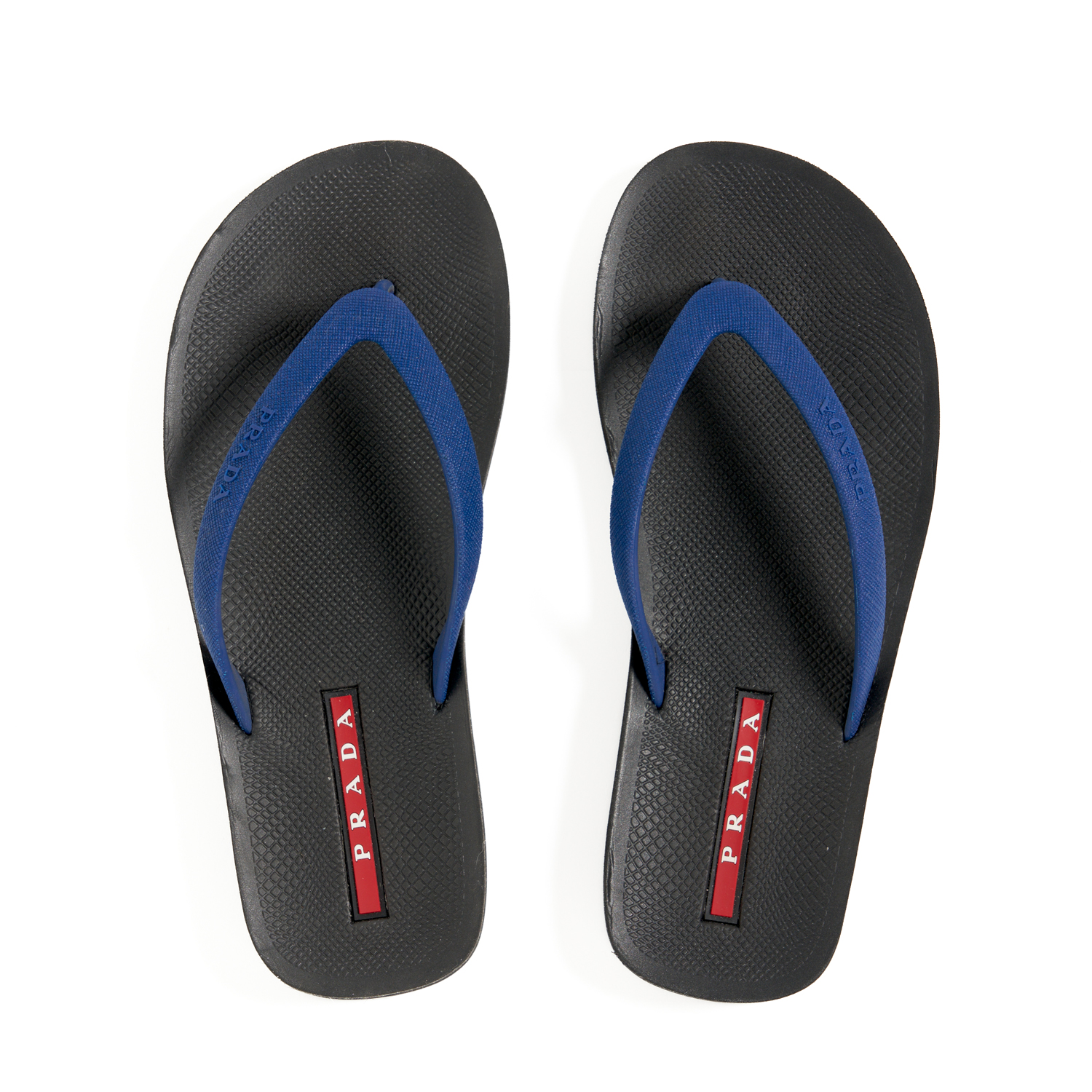 PRADA, A PAIR OF MEN'S FLIP FLOPS BLACK AND BLUE RUBBER, LENGTH 28CM, ACCOMPANIED BY A DUSTBAG
