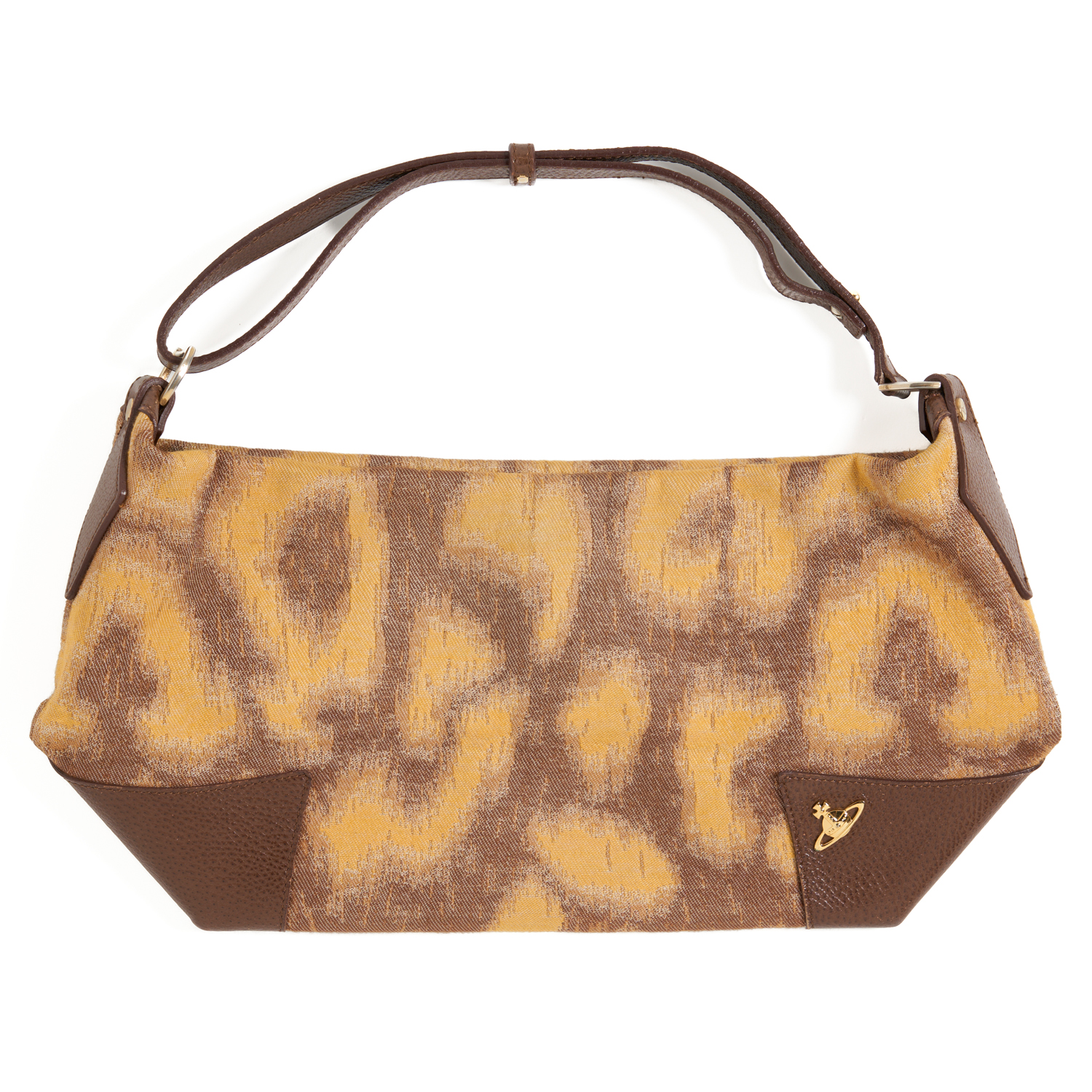 VIVIENNE WESTWOOD, A HANDBAG, STYLED IN MUSTARD AND BROWN FABRIC WITH BROWN LEATHER TRIM AND GOLD METAL HARDWARE, 20 X 44 X 15 CM