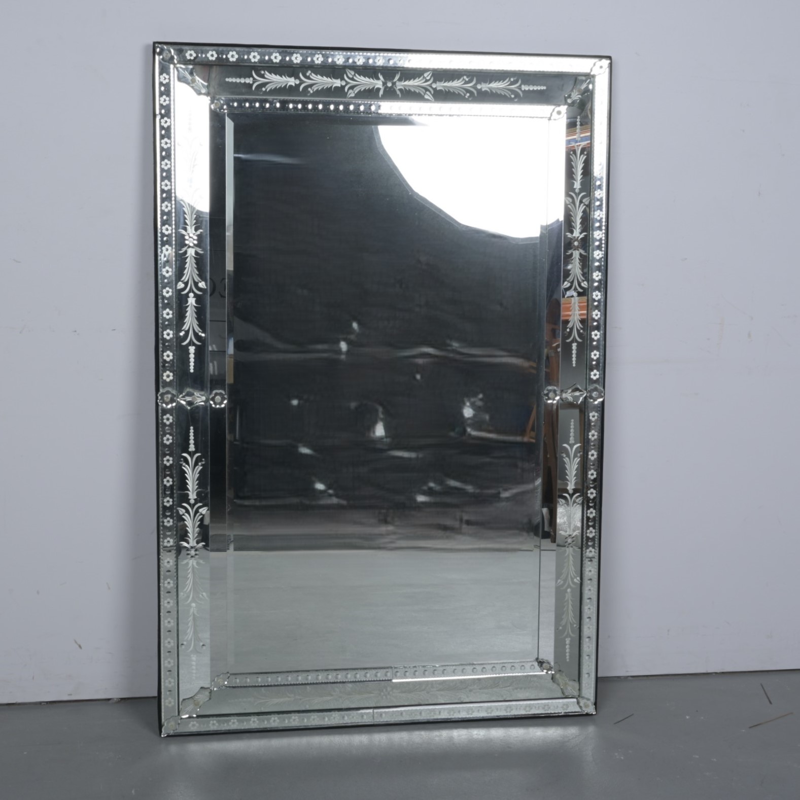 A LARGE VENETIAN-STYLE CUSHION-FRONT MIRROR, WITH ETCHED DECORATION TO THE MARGINAL PLATES (A/F) (152CM H X 101CM W) (THIS ITEM MUST BE REMOVED BY CARRIERS AT THE CUSTOMER'S EXPENSE. LEONARD JOEL STAFF CANNOT ASSIST CARRYING THIS ITEM)