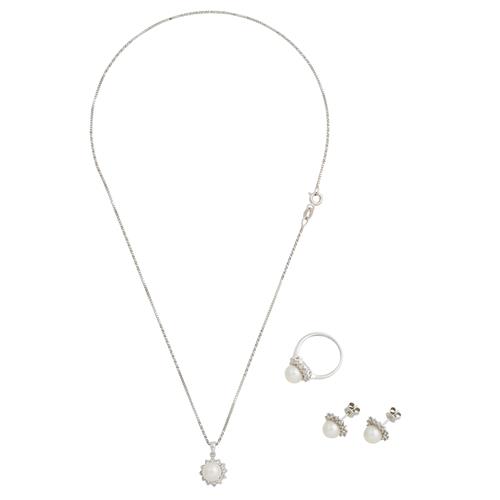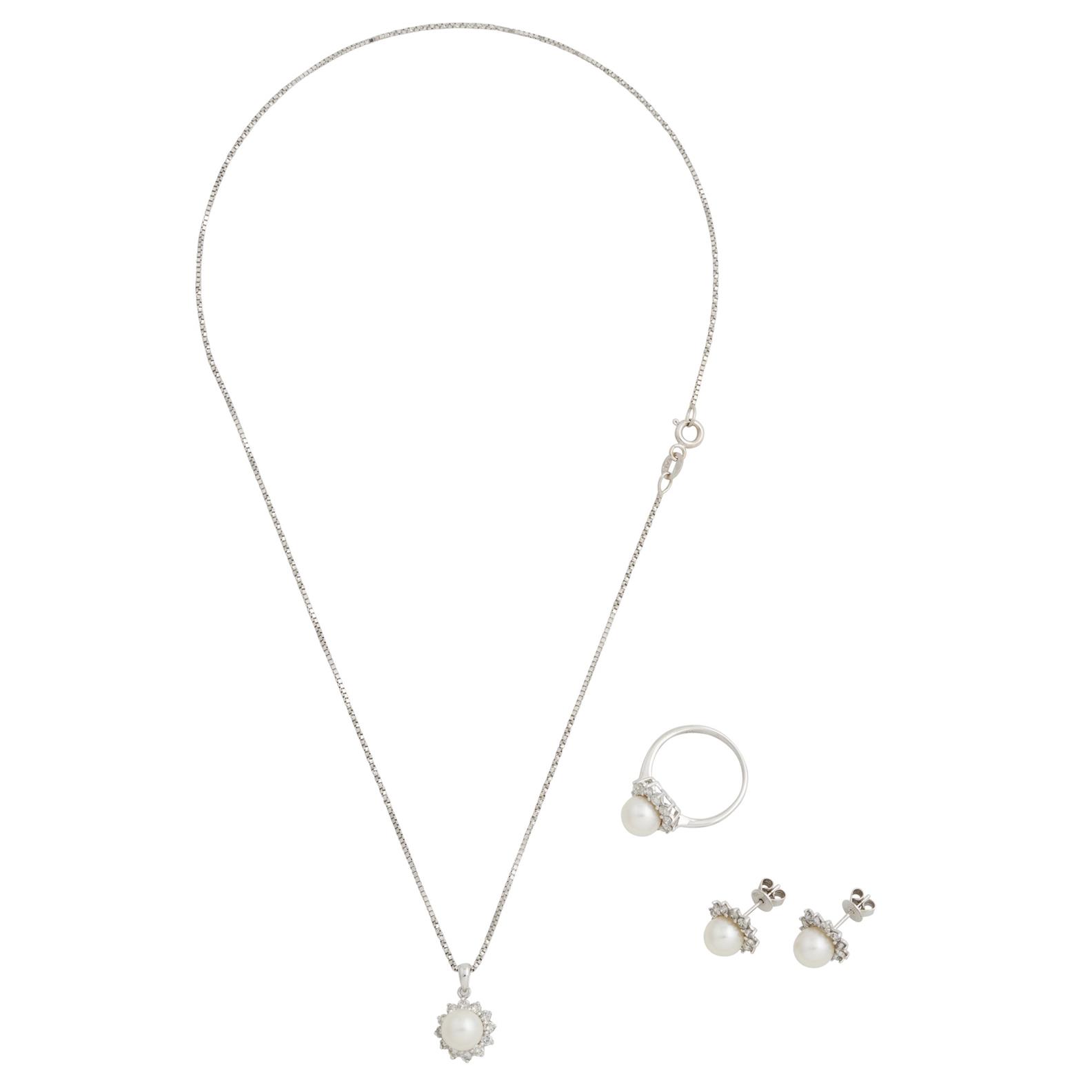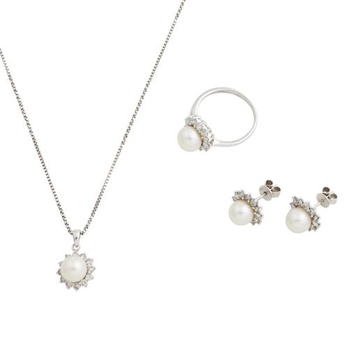 Comprising: a pendant of cluster design centring a cultured pearl within a frame of claw-set brilliant-cut diamonds, the ring and earrings each of similar style, the diamonds together weighing approximately 1.20 carats, mounted in 18ct white gold, ring size J, pendant length 10mm, inner circumference of necklace 400mm, the earrings to post and scroll fittings, gross combined weight approximately 9.6 grams.