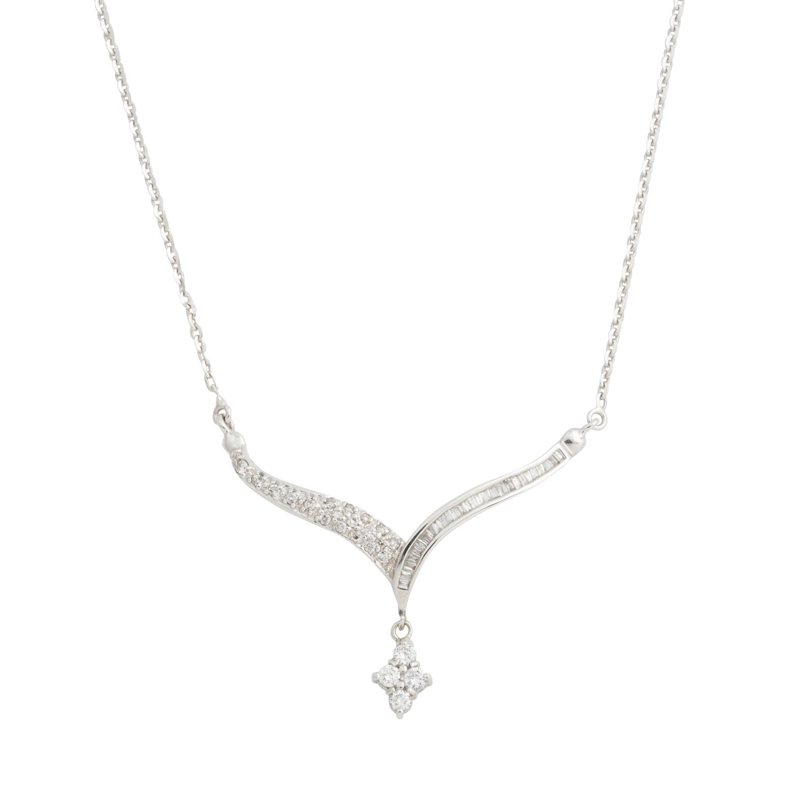 Terminating in a swing drop of four claw-set brilliant-cut diamonds, surmounted by pavé and channel-set baguette and brilliant-cut diamonds, completed by a trace chain, the diamonds together weighing approximately 0.50 carats, mounted in 18ct white gold, pendant length 35mm, inner circumference 415mm, gross weight approximately 5.72 grams.