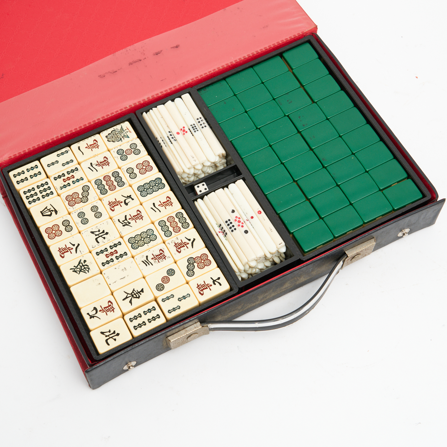 A VINTAGE GREEN AND WHITE BAKELITE MAH-JONG SET L.29CM (CASE)