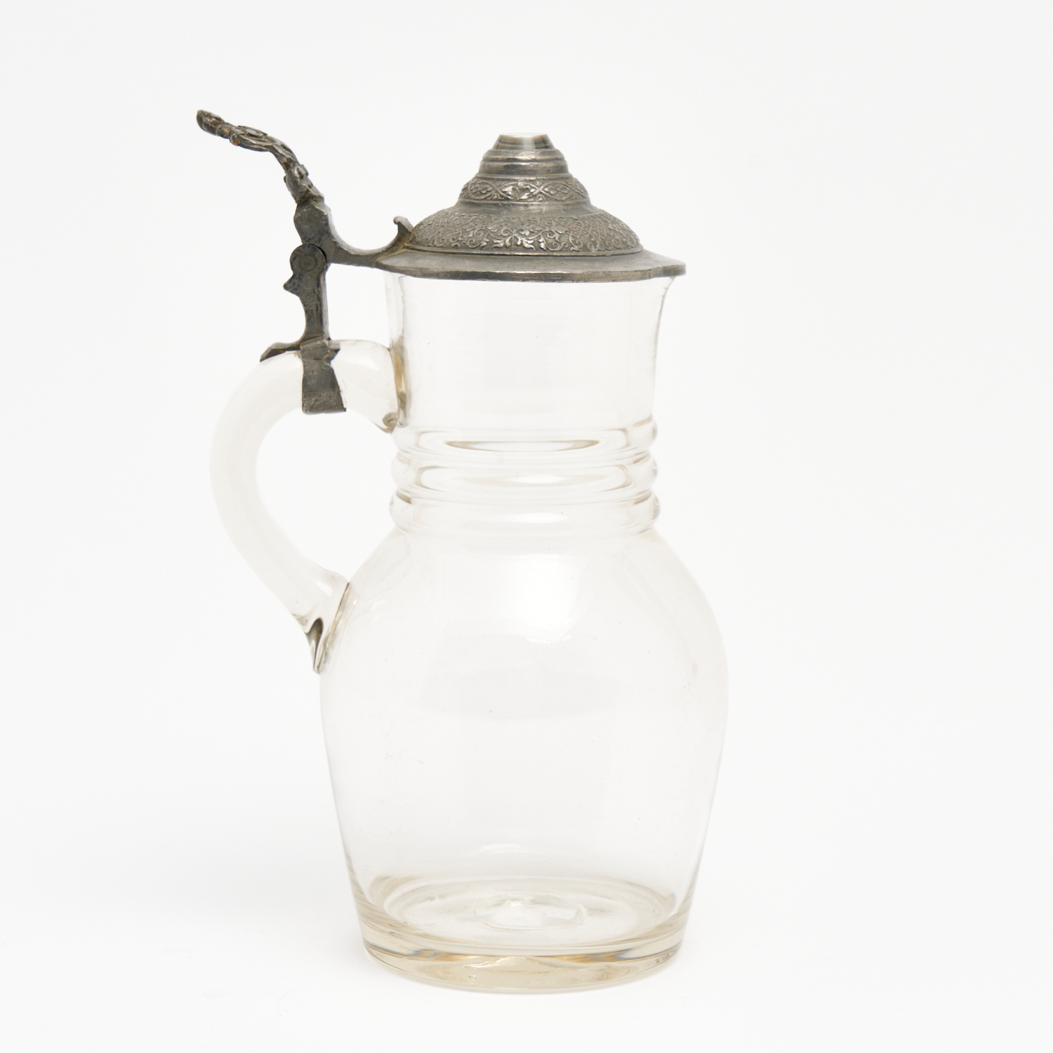 AN ANTIQUE EUROPEAN GLASS AND PEWTER MOUNTED JUG H.25CM