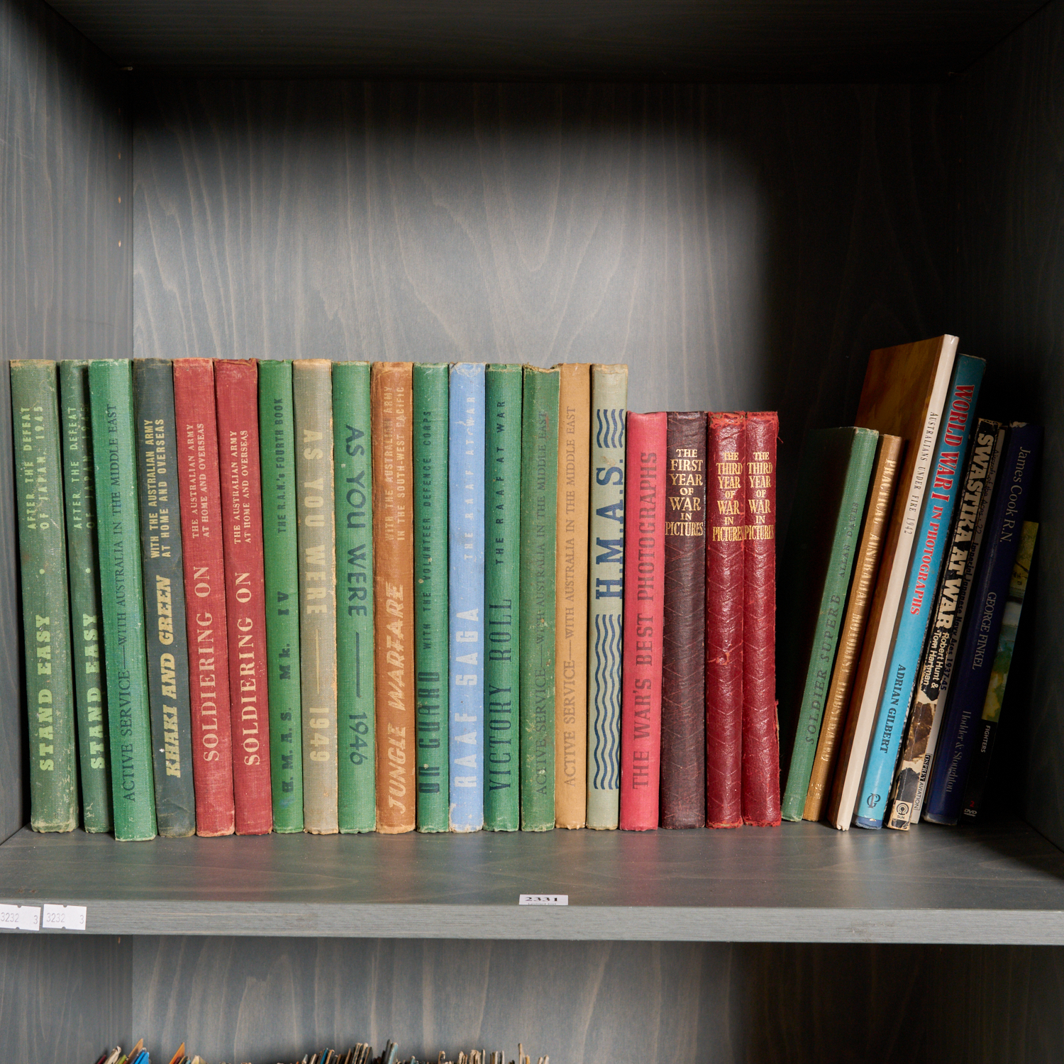 A SHELF OF MILTARY REFERENCE BOOKS INCUDING A NUMBER OF AUSTRALIAN WAR MEMORIAL PUBLICATIONS