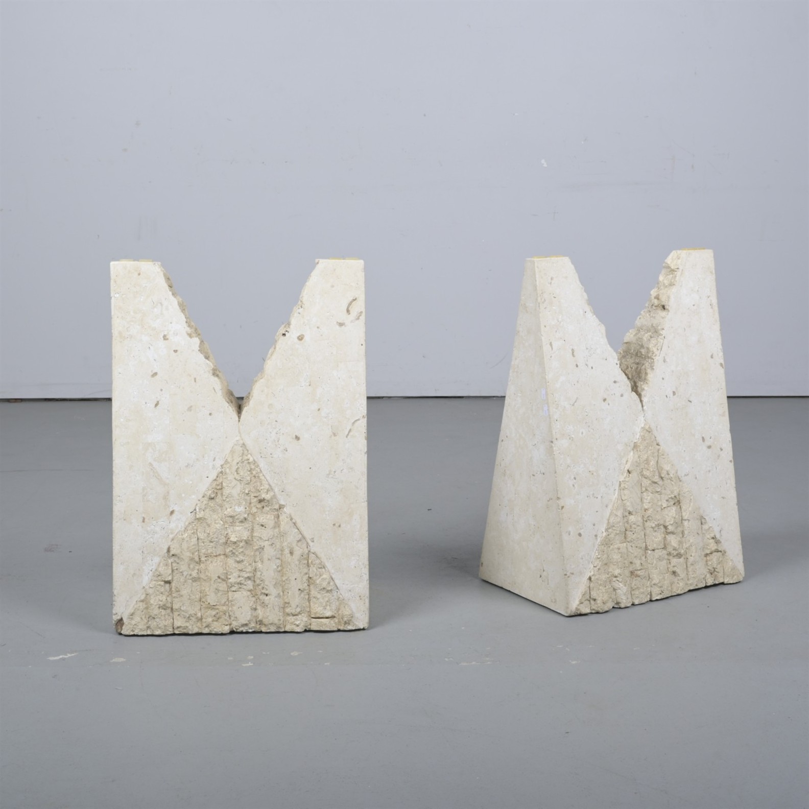 A PAIR OF COMPOSITE PLINTH BASES, SIMULATING TRAVERTINE (74CM H X 52CM W X 33CM D)
