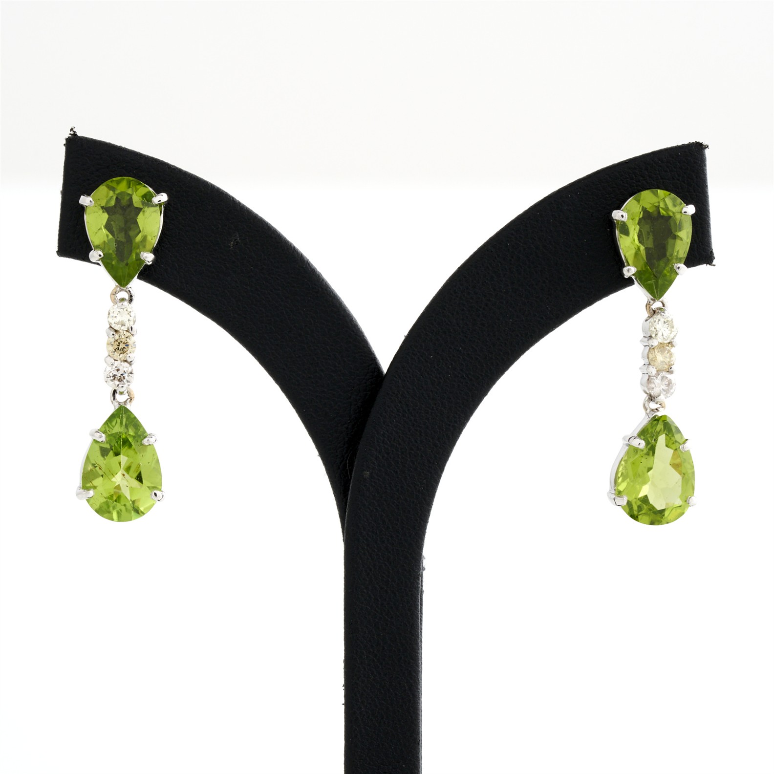 A PAIR OF PERIDOT AND DIAMOND EARRINGS IN 18CT WHITE GOLD, THE PERIDOTS WEIGHING 12.10CTS, THE DIAMONDS TOTALLING APPROXIMATELY 1.00CT, TO POST AND BUTTERFLY, 35MM, 7.63GMS