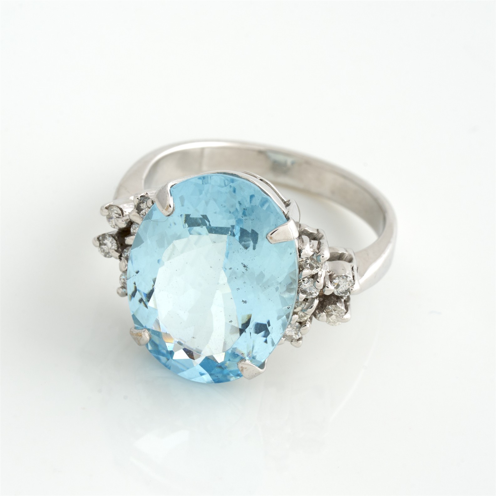 AN AQUAMARINE AND DIAMOND RING IN 18CT WHITE GOLD, THE AQUAMARINE WEIGHING 7.42CTS, THE DIAMONDS TOTALLING APPROXIMATELY 0.15CTS, SIZE N, 5.93GMS, ACCOMPANIED BY A VALUATION
