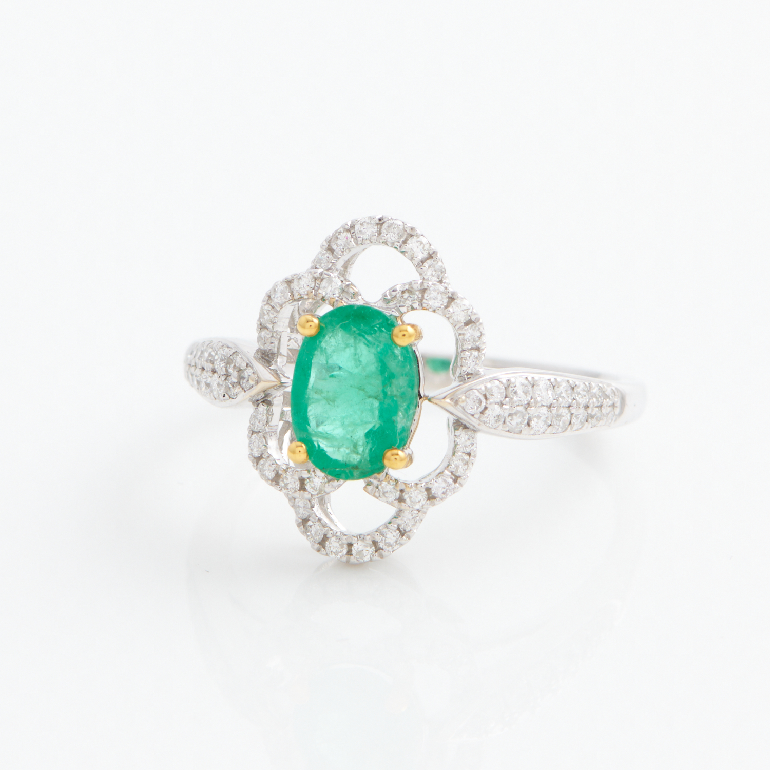 A ZAMBIAN EMERALD AND DIAMOND RING IN 14CT WHITE GOLD, THE EMERALD WEIGHING APPROXIMATELY 2.17CTS, SIZE O, 3.1GMS