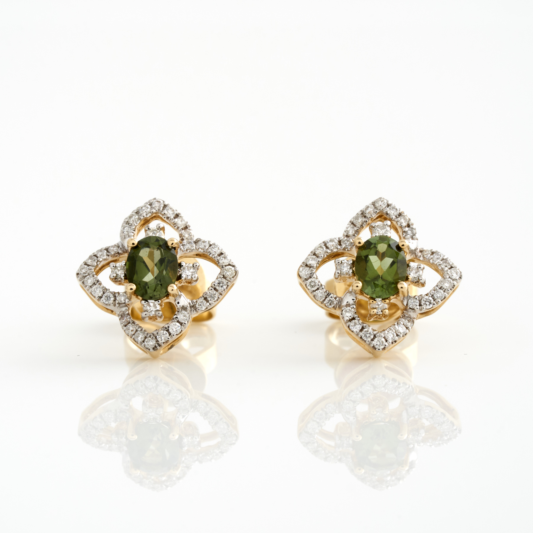 A PAIR OF TOURMALINE AND DIAMOND EARRINGS IN 14CT GOLD, THE TOURMALINES WEIGHING APPROXIMATELY 0.61CTS, TO POST AND BUTTERFLY FITTINGS, 2.8GMS