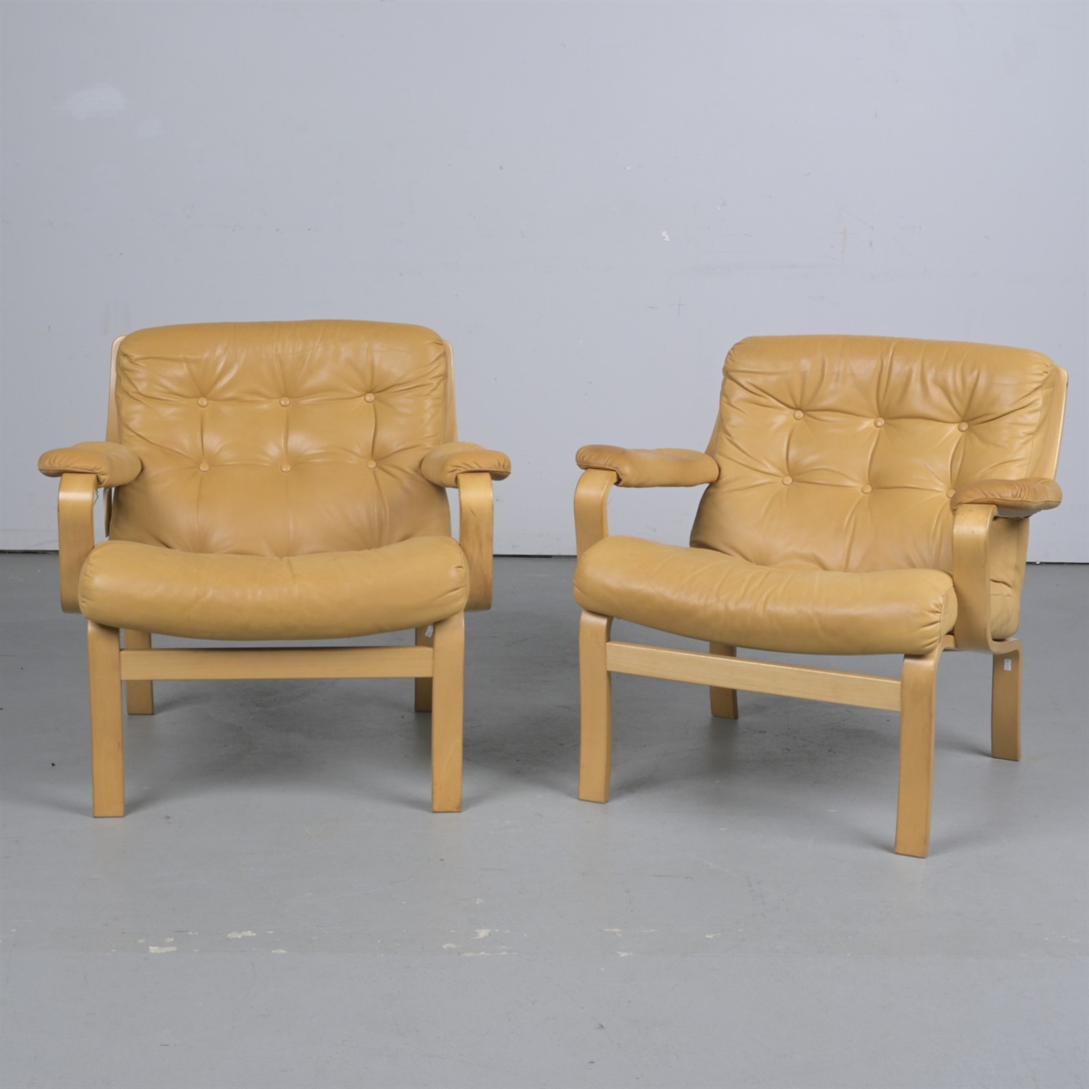 A PAIR OF SCANDINAVIAN TAN LEATHER AMCHAIRS IN THE MANNER OF BRUNO MATHSSON (75CM H X 78CM W X 80CM D)