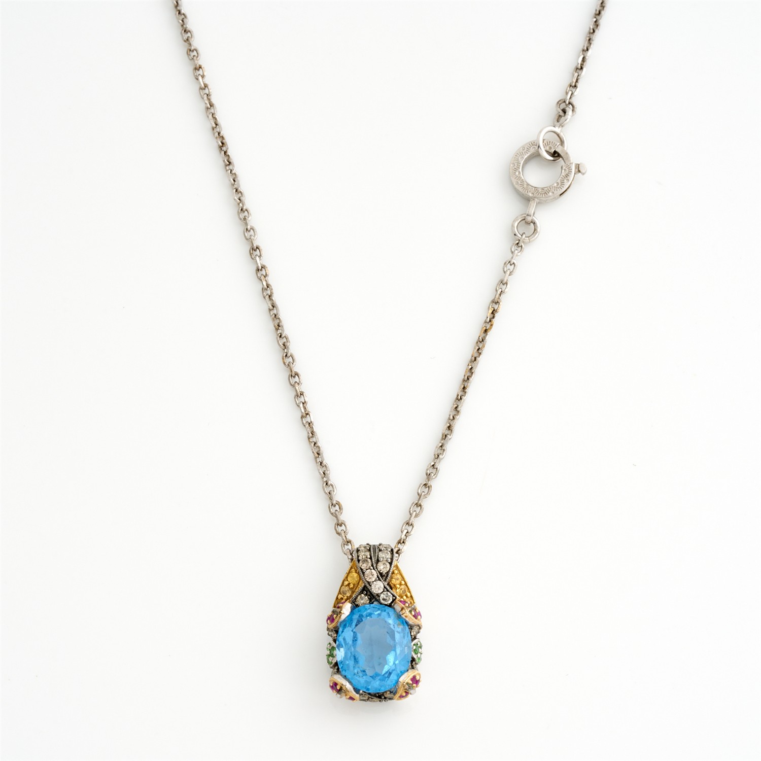 A TOPAZ, DIAMOND AND GEM-SET PENDANT IN 18CT WHITE GOLD, 25MM X 15MM TO A CURB LINK CHAIN IN SILVER, 440MM, 11.9GMS