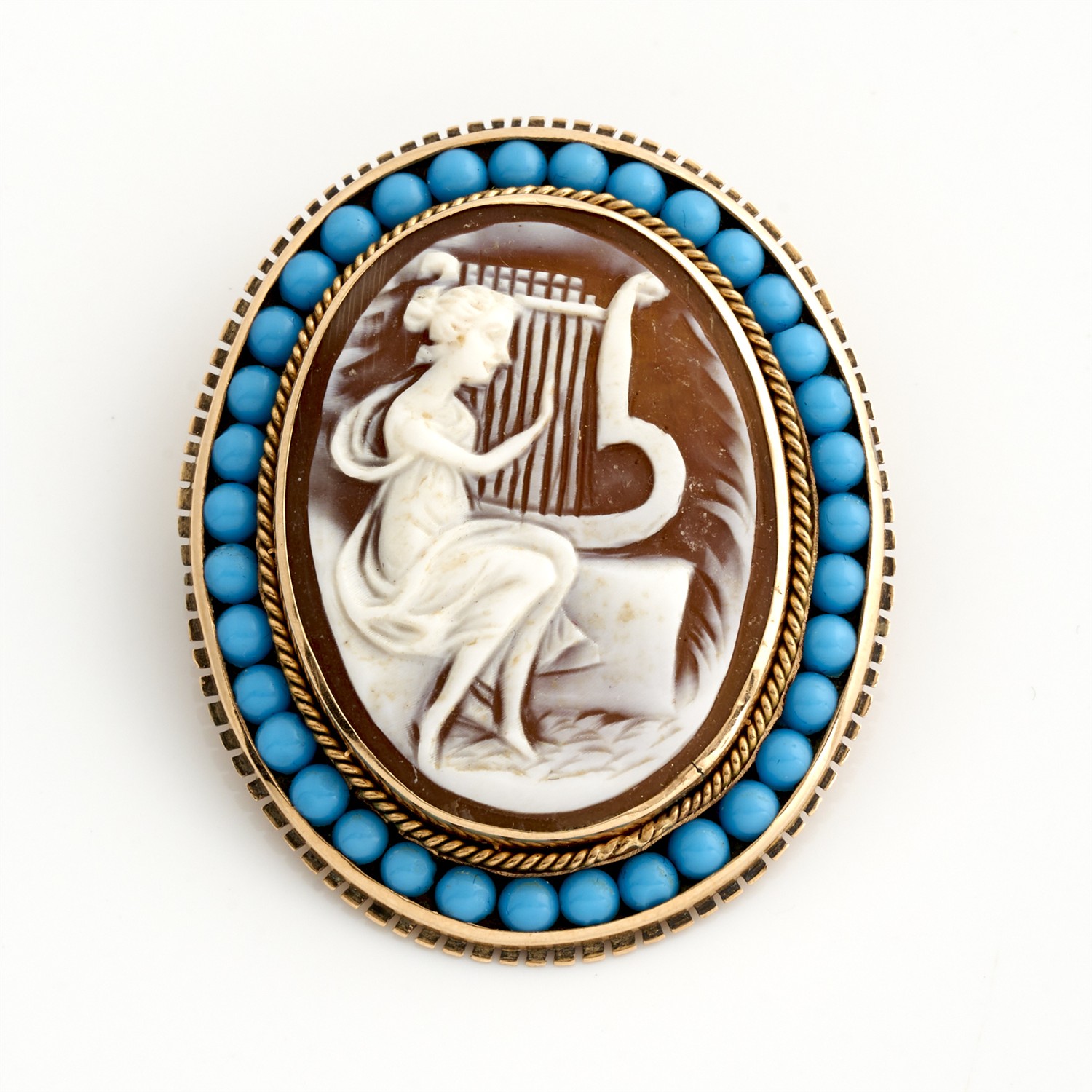 A SHELL CAMEO AND GEM-SET BROOCH/PENDANT IN 14CT GOLD, 42 X 38MM, 10.6GMS