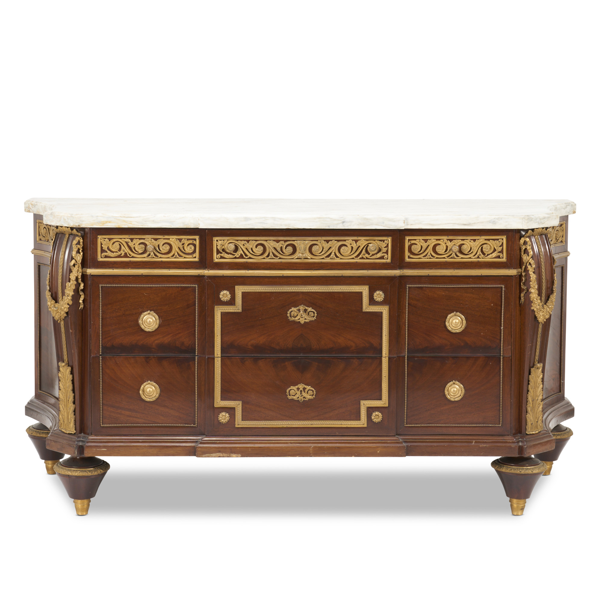 The straight front between concave outswept sides, the thick variegated white, grey, and yellow-pink marble top above three frieze drawers and two long drawers, on toupie feet, gilt bronze mounts and mouldings throughout including Vitruvian scroll panels to the frieze