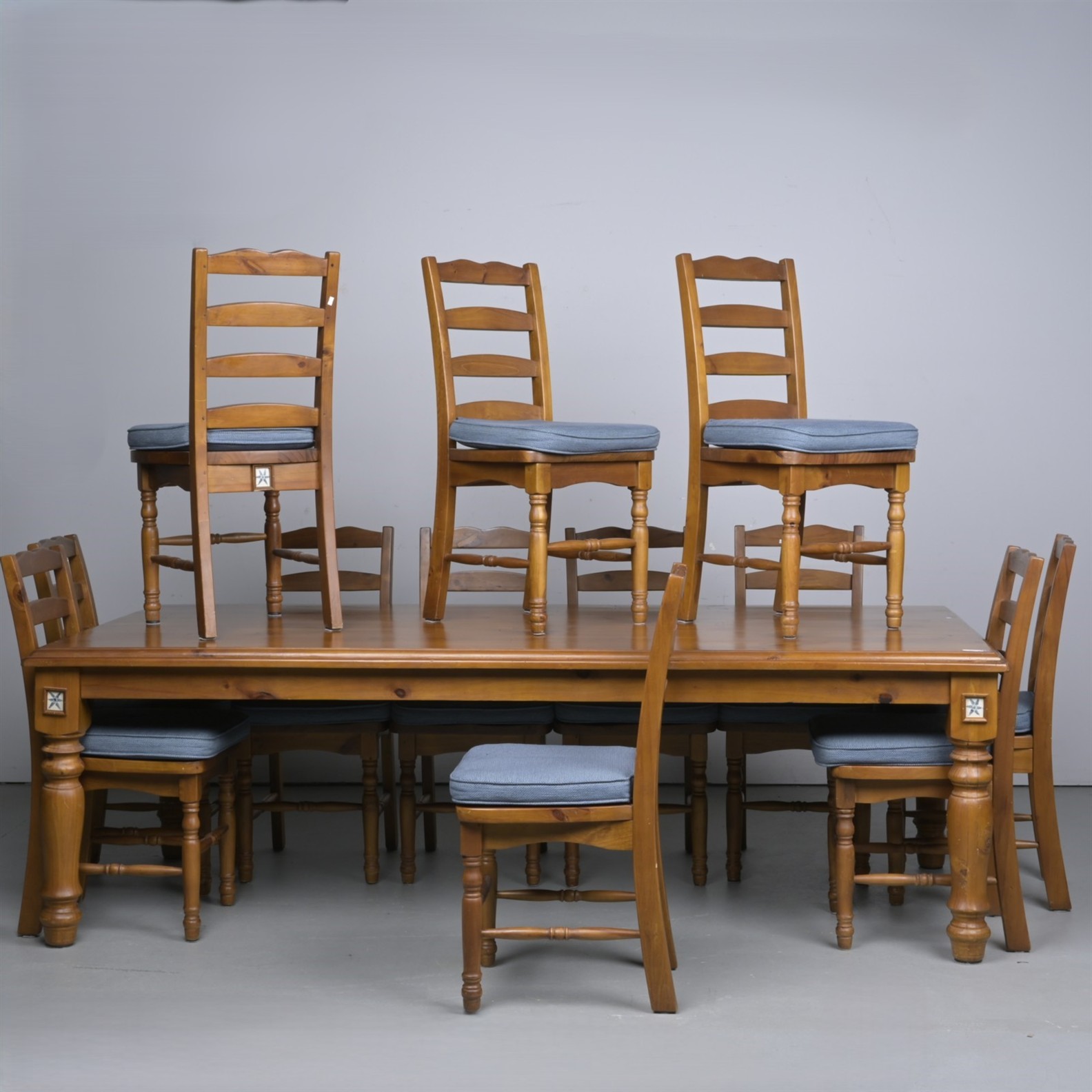 A STAINED PINE DINING SUITE IN ANTIQUE MANNER, COMPRISING A TABLE AND TWELVE CHAIRS (A/F) (79CM H X 250CM W X 120CM D) (THIS ITEM MUST BE REMOVED BY PROFESSIONAL CARRIERS OR CLIENTS. LEONARD JOEL STAFF CANNOT ASSIST WITH CARRYING OR DELIVERY OF THIS ITEM)