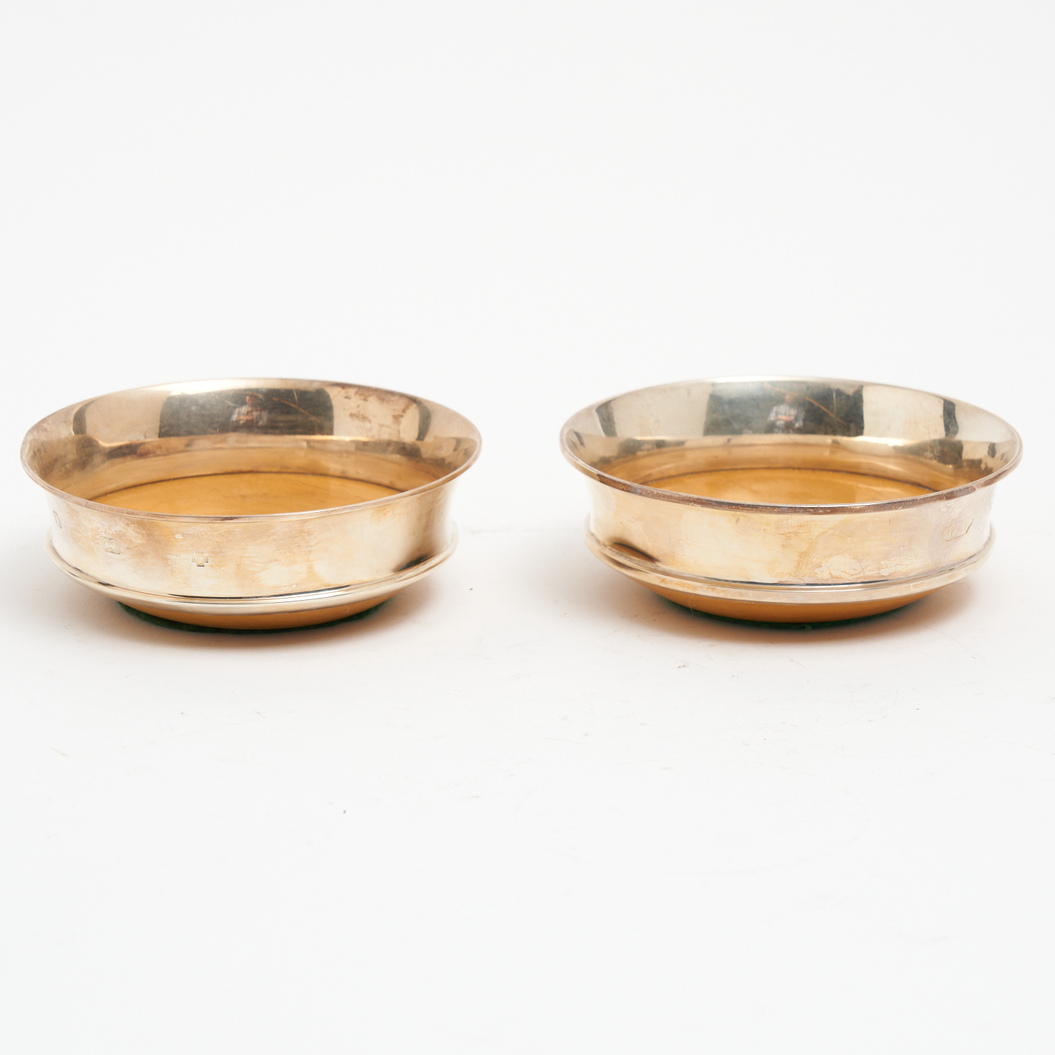A PAIR OF ELIZABETH II STERLING SILVER MOUNTED BOTTLE COASTERS