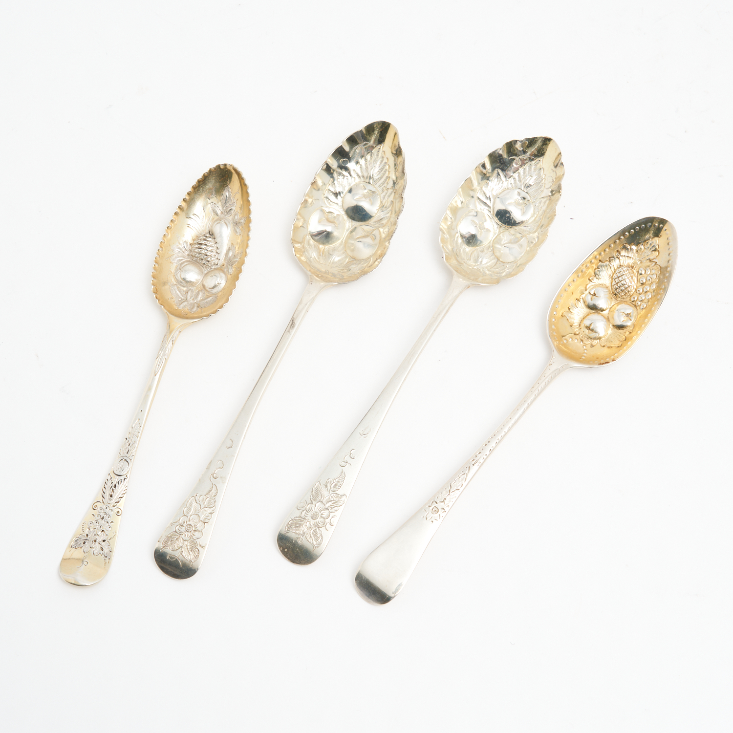 A PAIR OF GEORGE III STERLING SILVER BERRY SPOONS, THOMAS DICKS, LONDON, 1813, TOGETHER WITH TWO OTHER GEORGE III BERRY SPOONS, 236G