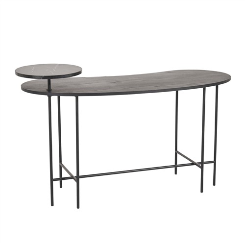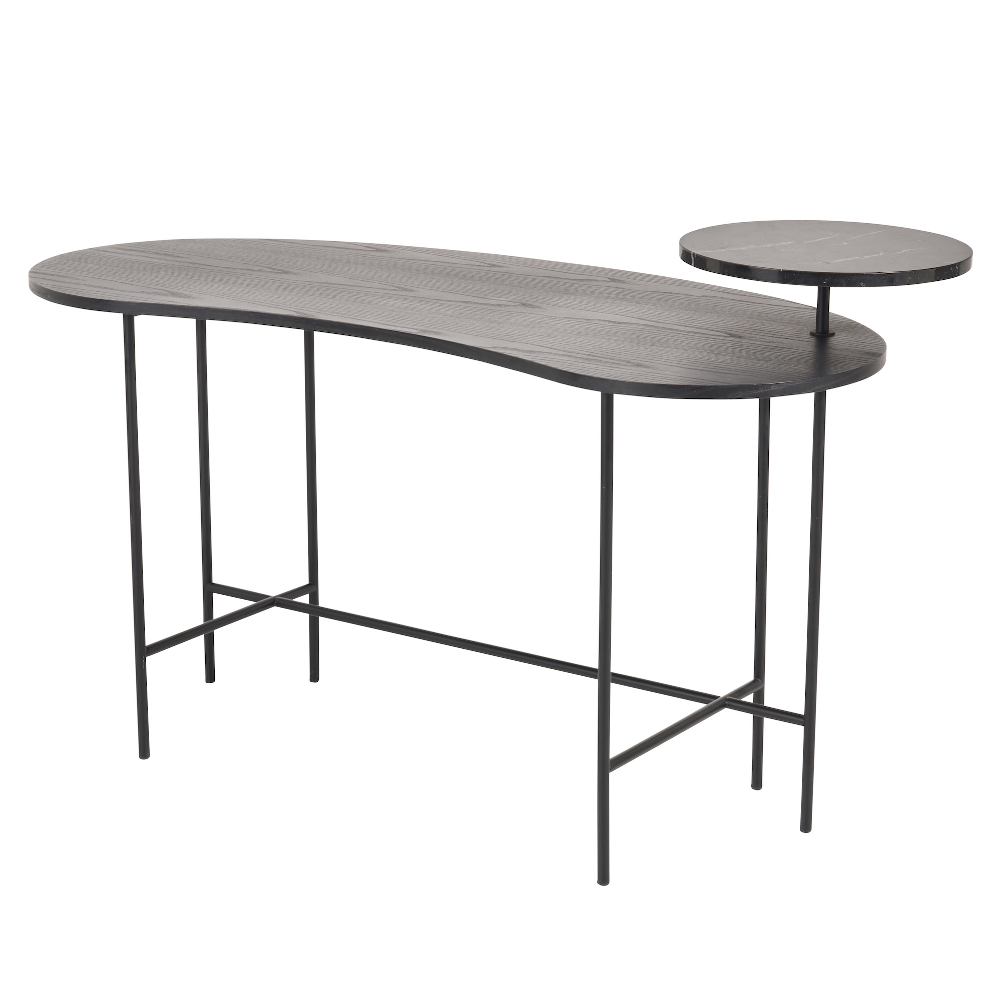 Two-tiers with black lacquered ash kidney bean shaped work surface and elevated circular Nero Marquina marble stand on powder coated steel tube base.