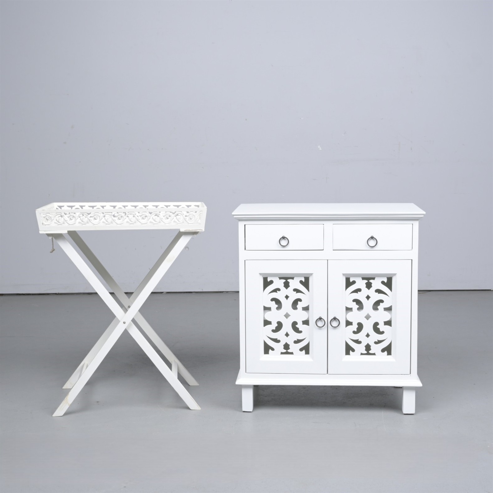 A WHITE-PAINTED BEDSIDE CABINET TOGETHER WITH A BUTLERS STAND (A/F) (71CM H X 65CM W X 40CM D)