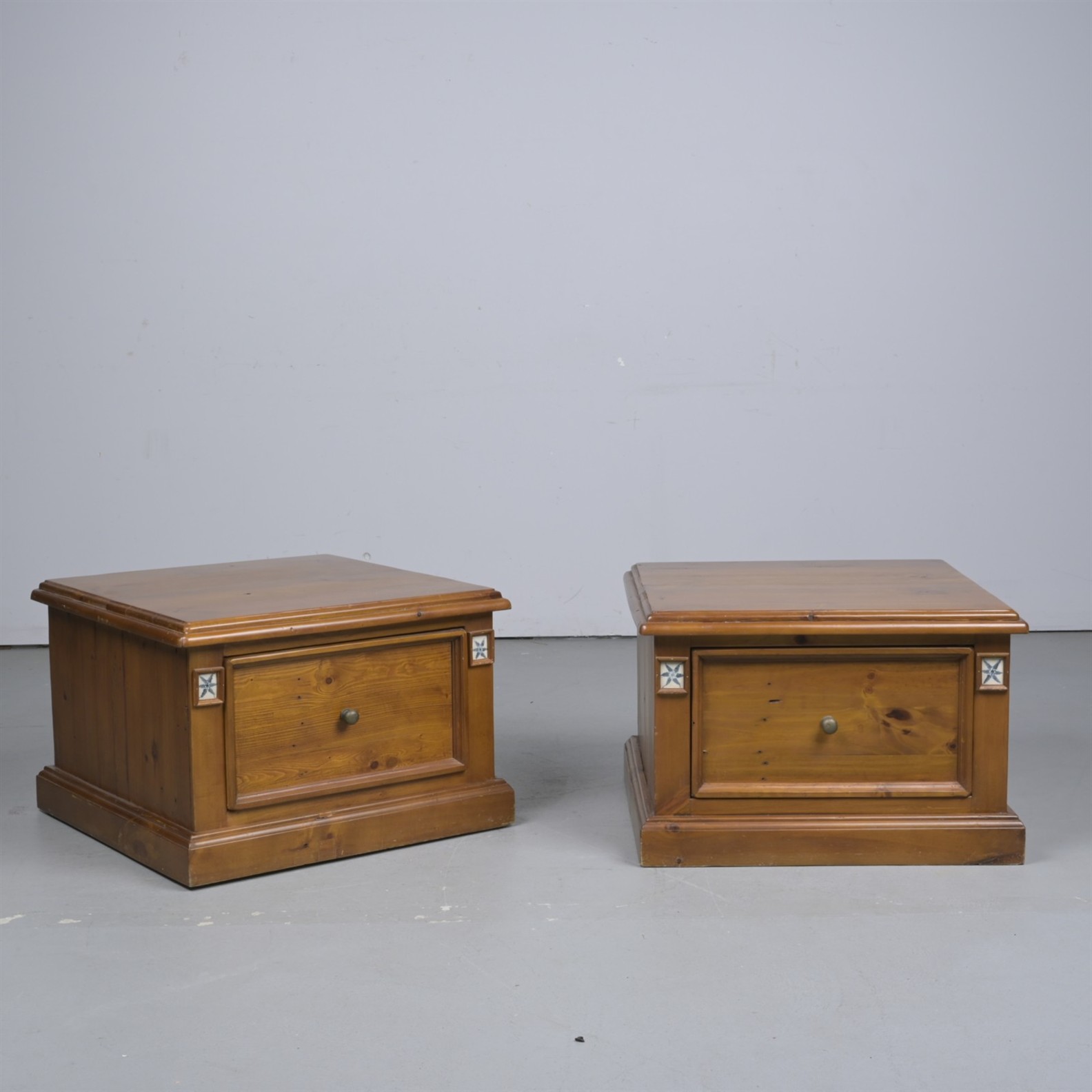A PAIR OF STAINED PINE LOW ENCLOSED TABLES, EACH WITH A DRAWER (52CM H X 76CM W X 75CM D) (THIS ITEM MUST BE REMOVED BY PROFESSIONAL CARRIERS OR CLIENTS. LEONARD JOEL STAFF CANNOT ASSIST WITH CARRYING OR DELIVERY OF THIS ITEM)