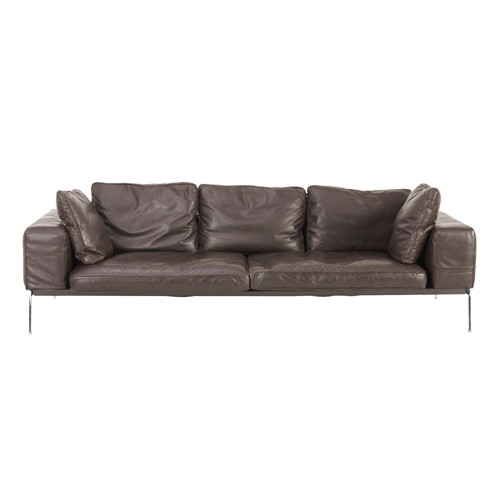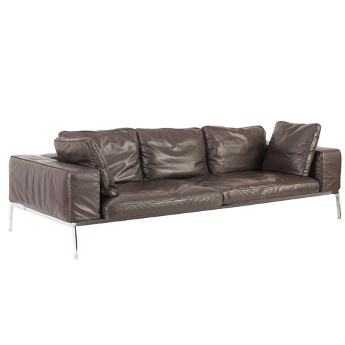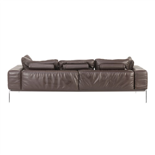 Chocolate leather upholstered goose down cushions with bolster detail to backrests. Deep seats with generously proportioned armrests. Frame and legs in polished steel.