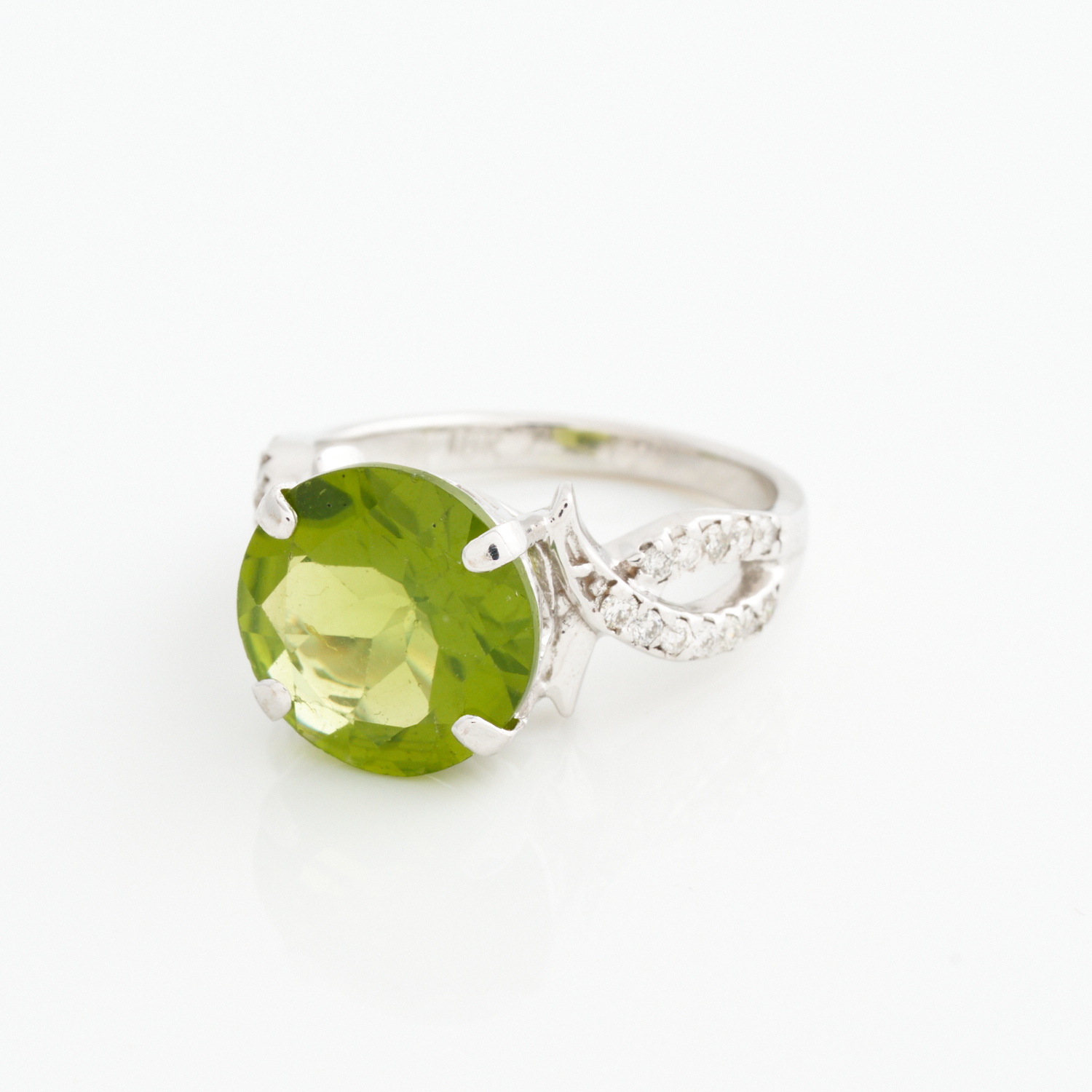 A PERIDOT AND DIAMOND RING IN 18CT WHITE GOLD, THE PERIDOT WEIGHING 5.32CTS, THE DIAMONDS TOTALLING APPROXIMATELY 0.25CTS, SIZE M, 5.56GMS