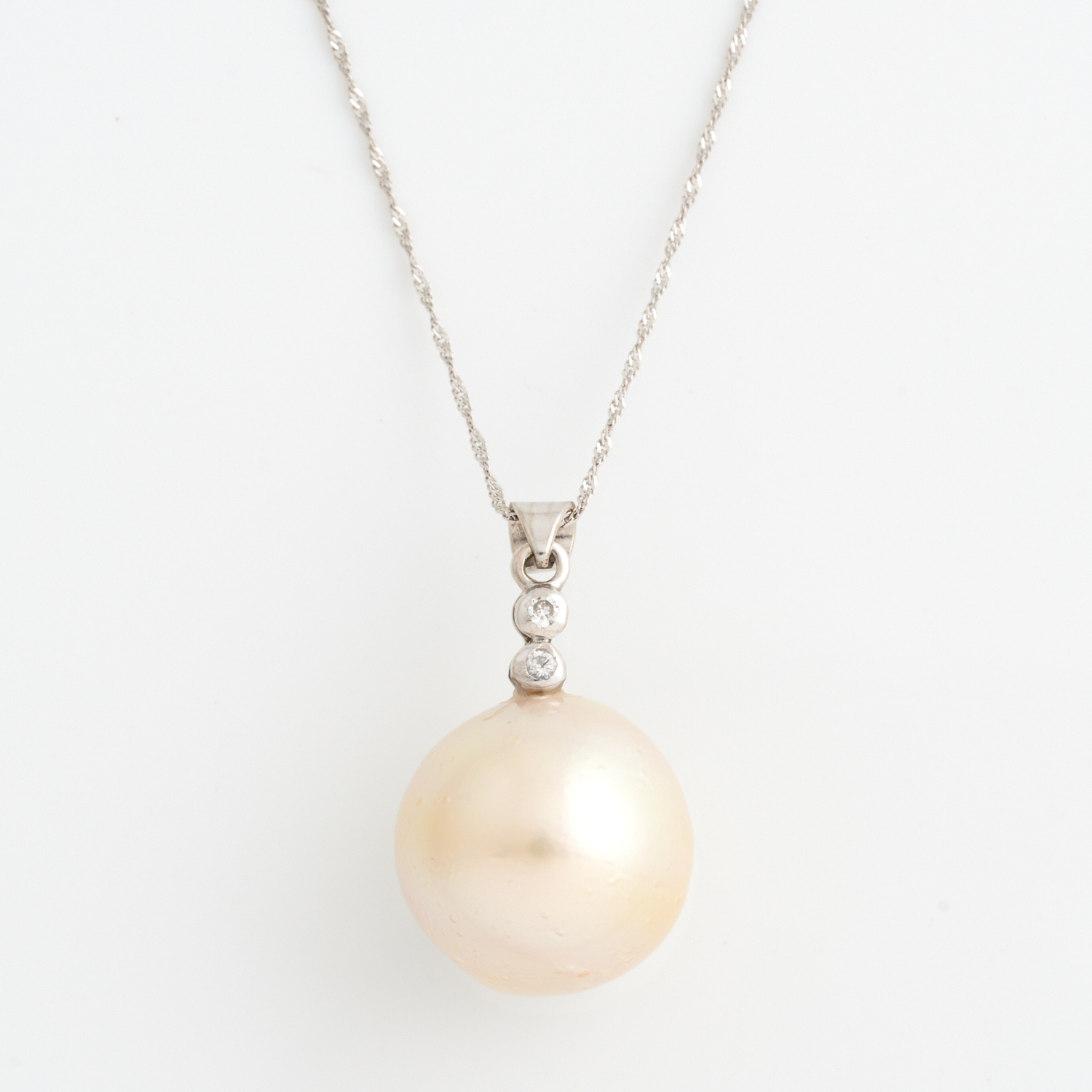 A SOUTH SEA PEARL AND DIAMOND PENDANT IN 18CT WHITE GOLD, THE PEARL MEASURING APPROXIMATELY 16.2MM, THE CHAIN MEASURING 500MM, 7.83GMS