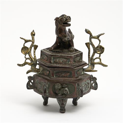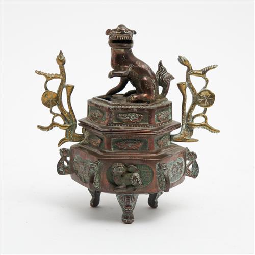 A CHINESE COPPER FINISHED LIDDED CENSER WITH FIGURAL FEET AND FOO LION FINIAL H.14CM