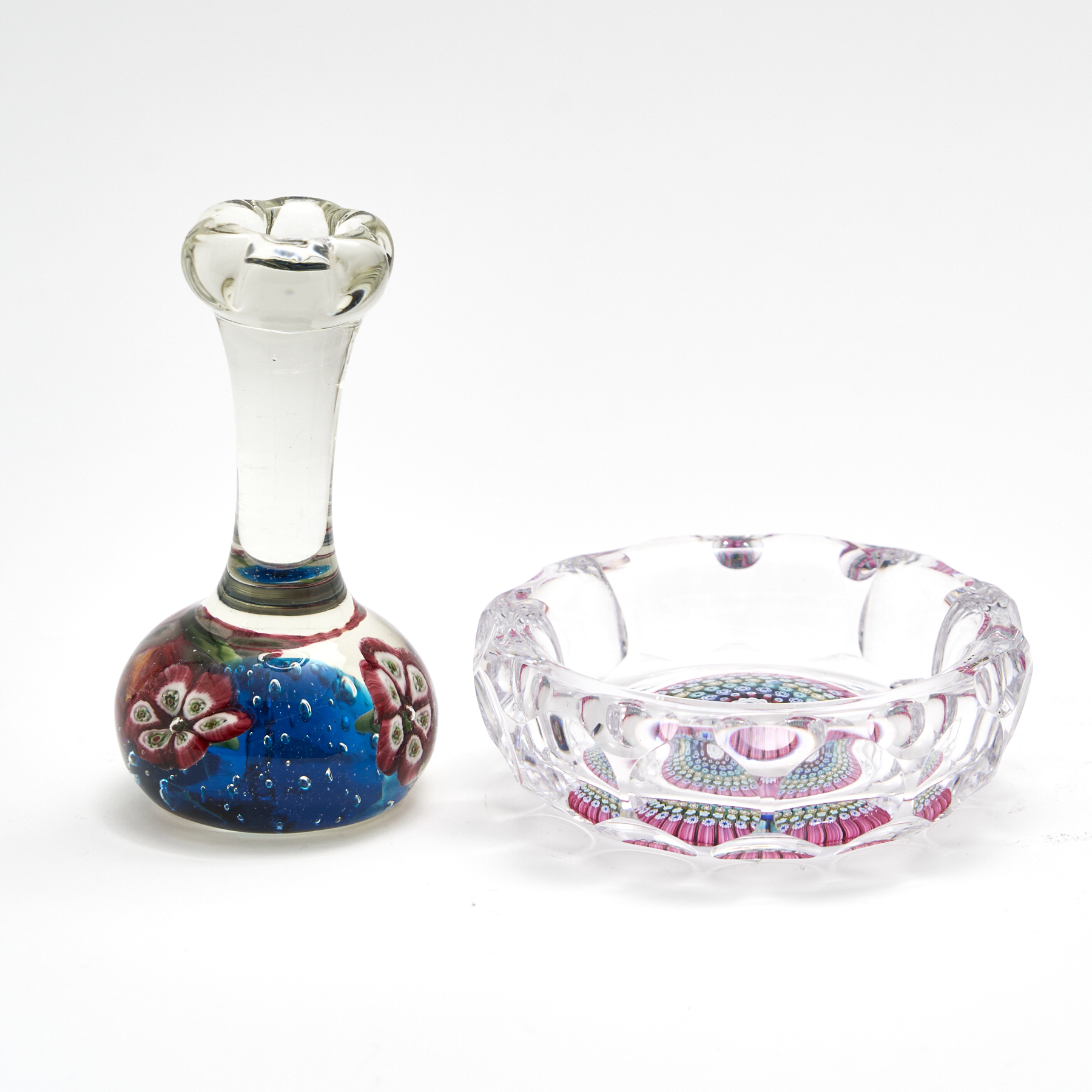 AN ITALIAN AND ENGLISH MILLEFIORI GLASS CANDLESTICK AND BOWL H.13CM (TALLEST)