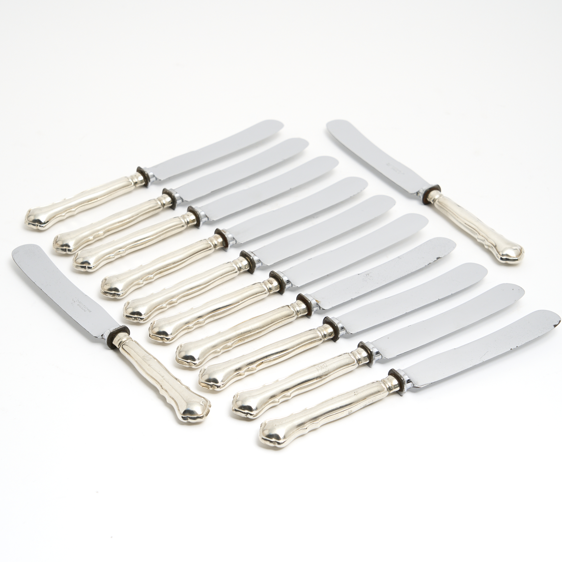 A SET OF 12 GERMAN 800 SILVER HANDLED DINNER KNIVES L.25CM