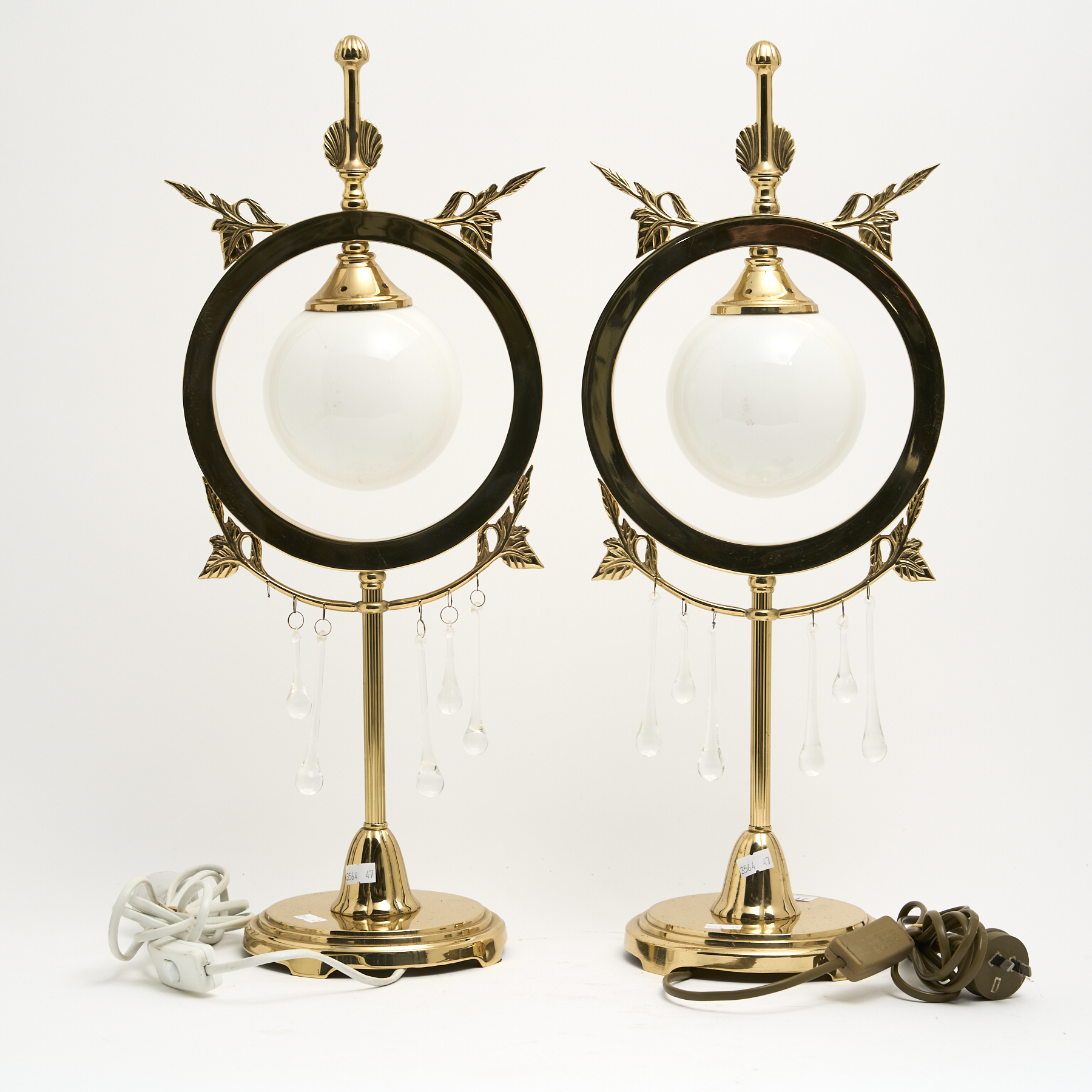 A PAIR OF VINTAGE BRASS AND CRYSTAL DROP DECORATIVE LAMPS (LUSTRE DROP MISSING) H.56CM