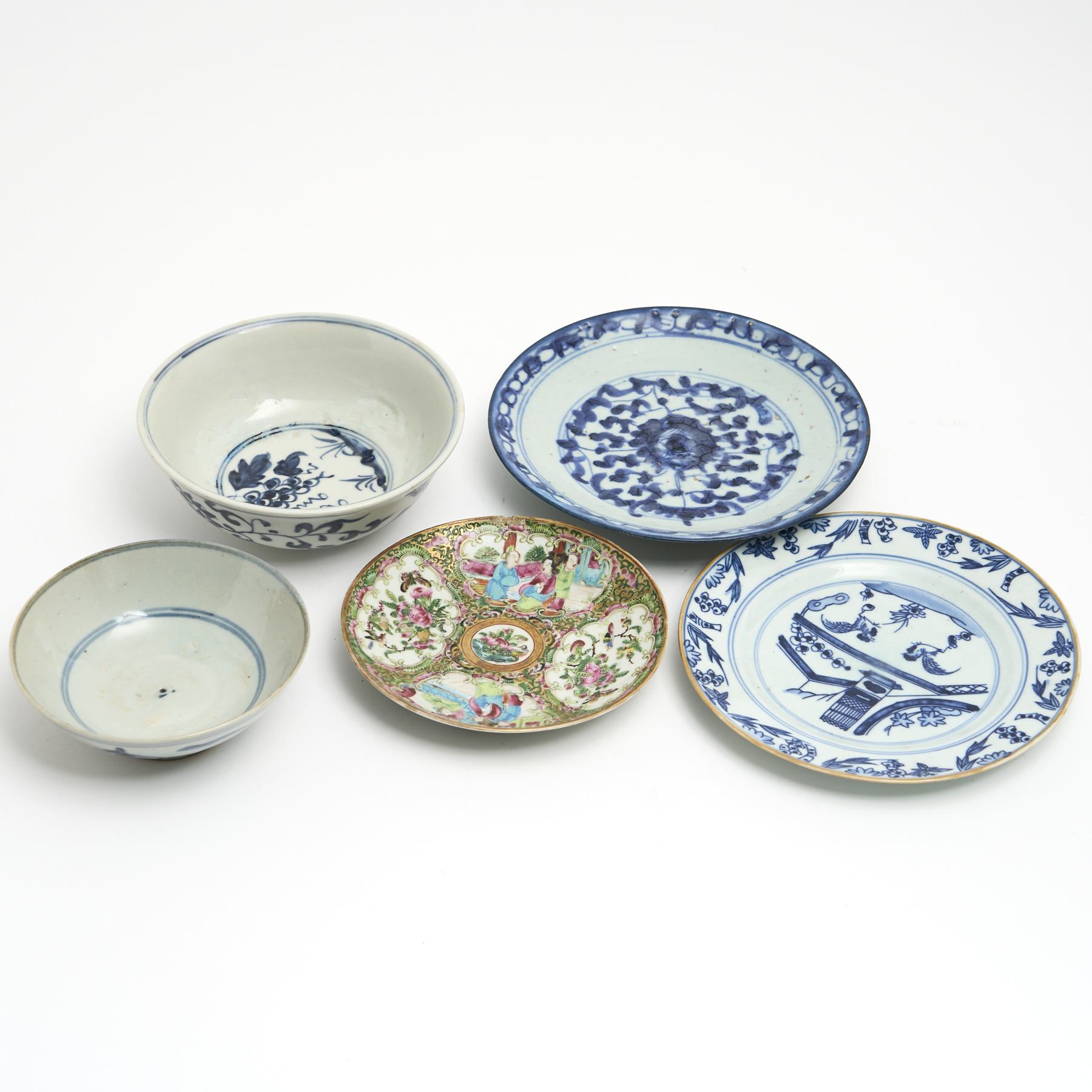 A GROUP OF CHINESE PORCELAIN INCLUDING A LATE MING FOOTED DISH AND TWO QING DYNASTY DISHES (A/F) DIA.19CM (LARGEST)