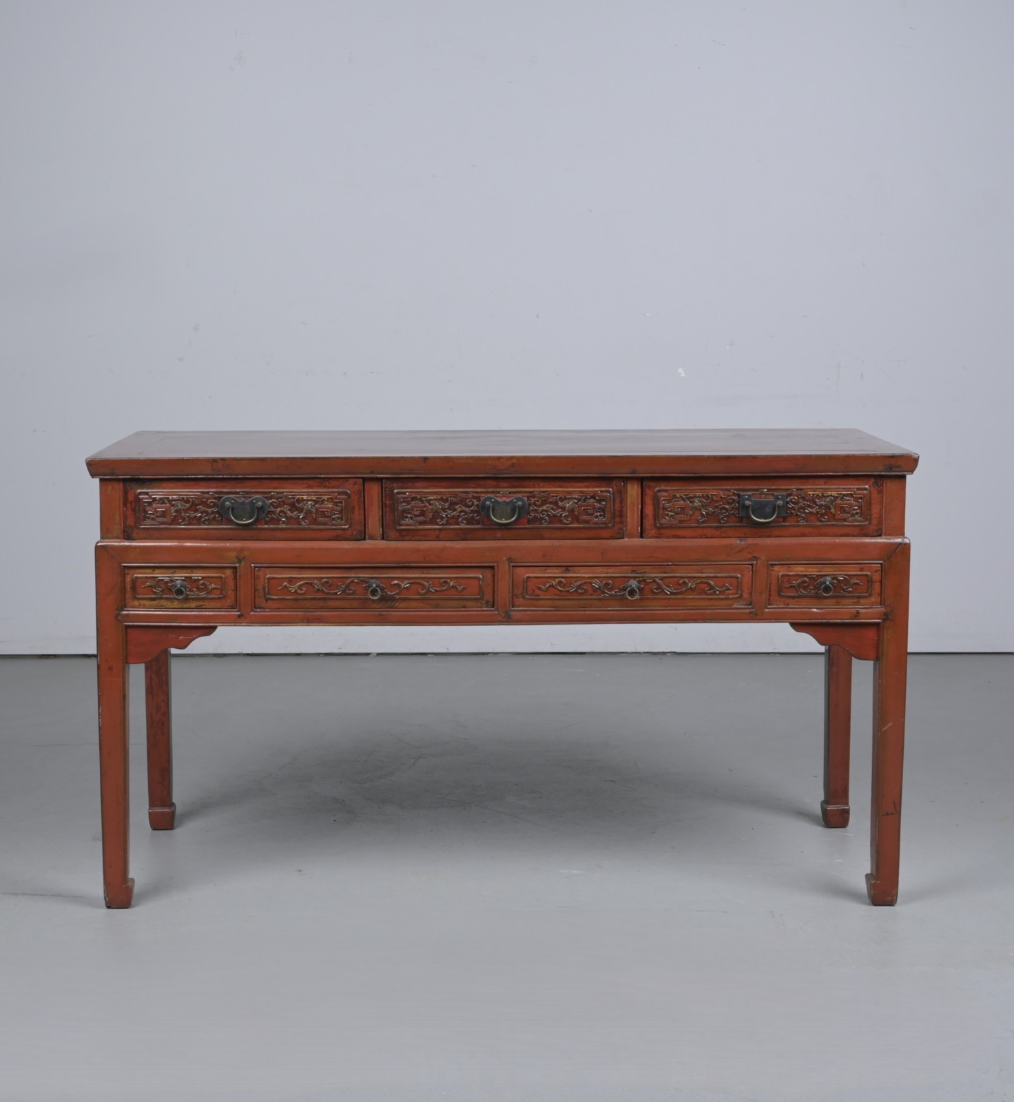 A CHINESE RED LACQUERED SIDE TABLE (87CM H X 154CM W X 61CM D) (THIS ITEM MUST BE REMOVED BY PROFESSIONAL CARRIERS OR CLIENTS. LEONARD JOEL STAFF CANNOT ASSIST WITH CARRYING OR DELIVERY OF THIS ITEM)