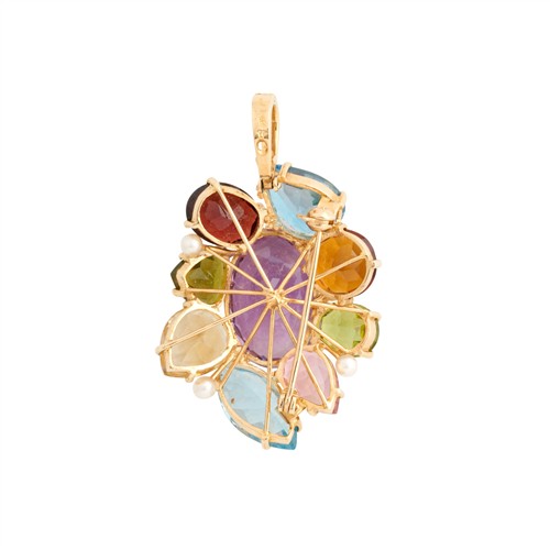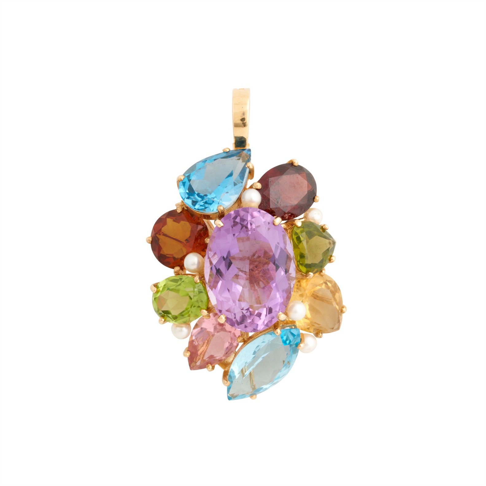 A MULTI GEM-SET BROOCH/PENDANT IN 14CT GOLD, 30 X 50MM, TOTAL WEIGHT 13.6 GMS