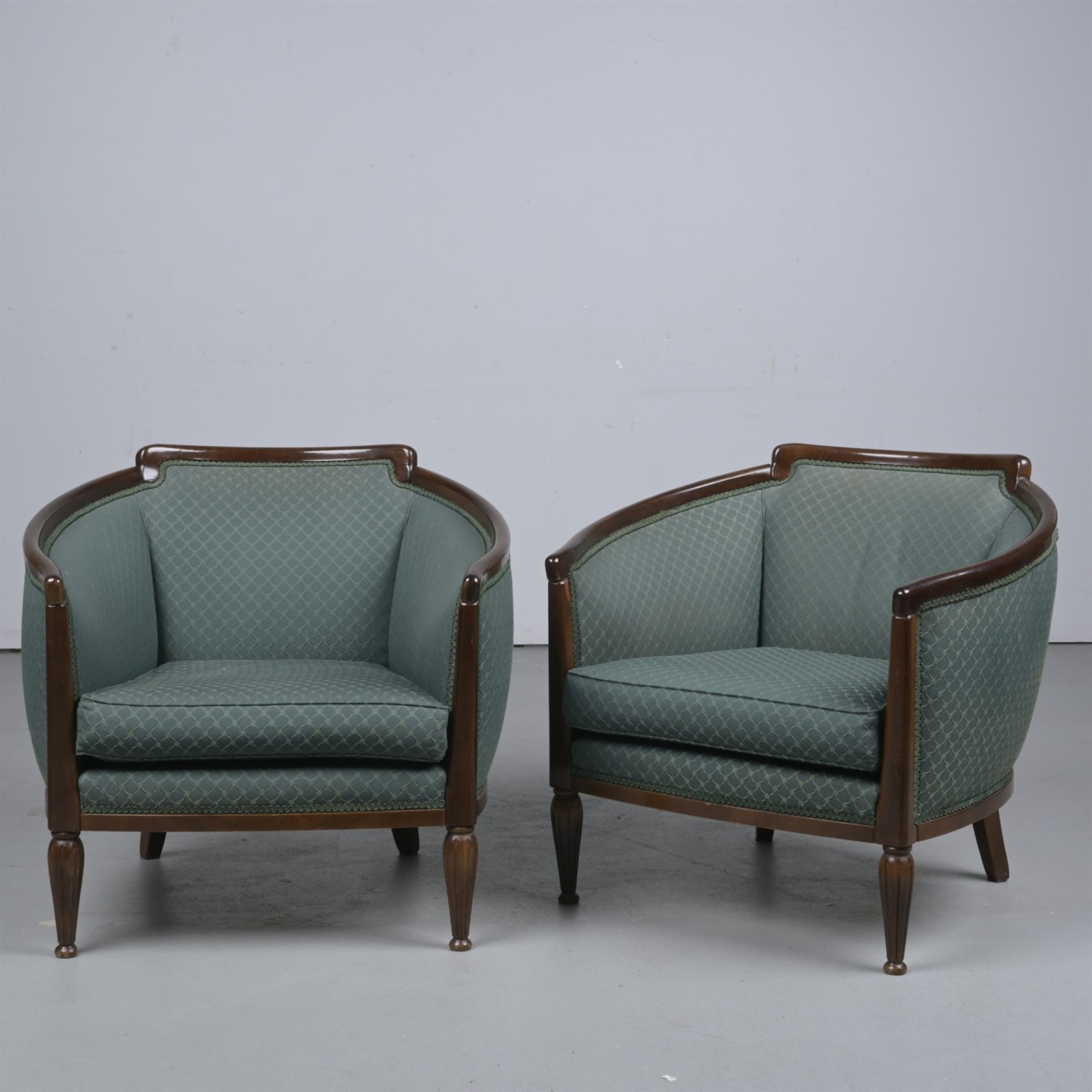 A PAIR OF ART DECO UPHOLSTERED ARMCHAIRS (SIGNS OF RESTORATION) (78H X 84W X 81D CM) (PLEASE NOTE THERE MAY BE SOME COLOUR VARIATION FROM PHOTOGRAPH)