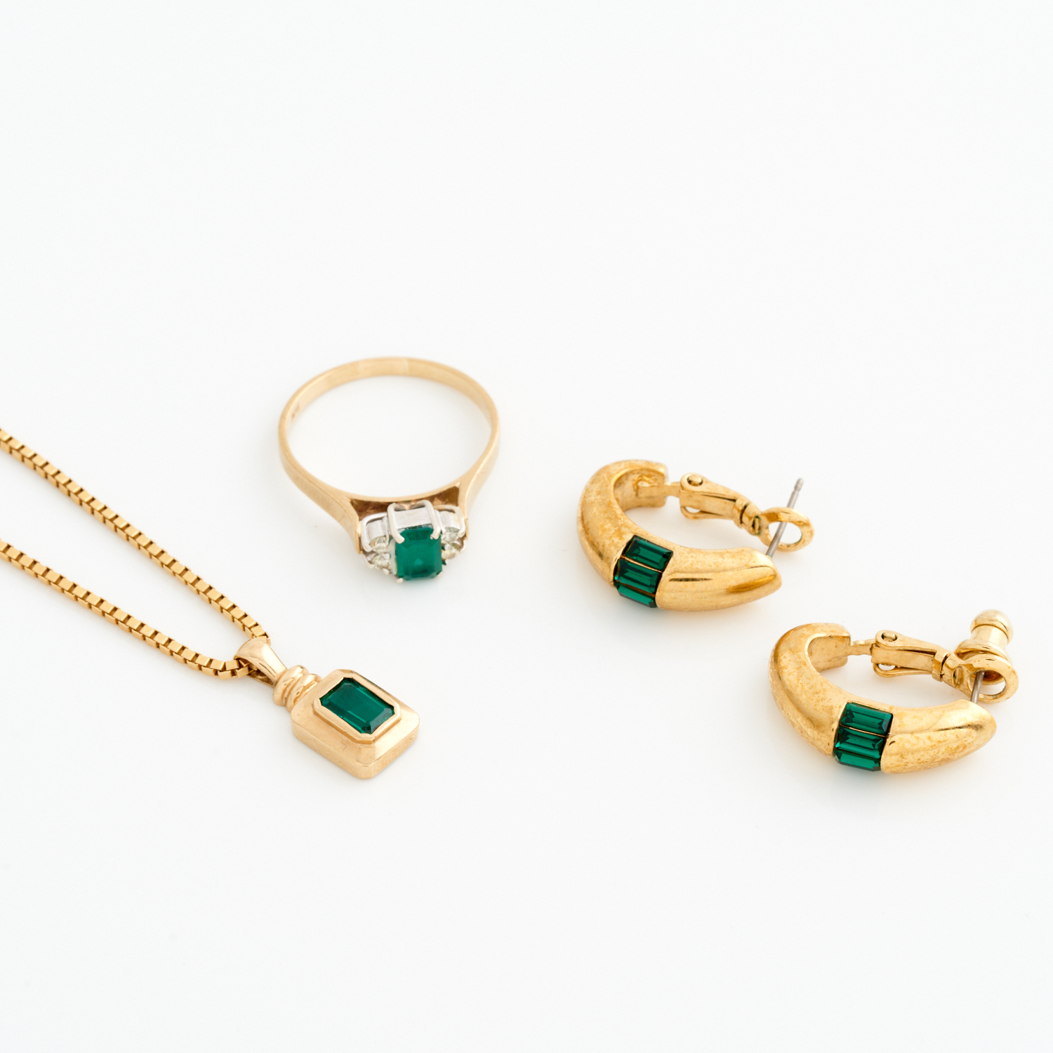 A GEM SET SUITE IN 9CT GOLD AND GOLD PLATE, COMPRISING A RING, SIZE Q, A PENDANT TO A BOX LINK CHAIN, THE CHAIN MEASURING 400MM, THE PENDANT 15MM X 18MM, TOGETHER WITH A PAIR OF EARRINGS TO POST AND CLIP FITTINGS IN GOLD PLATE, 20MM X 17MM