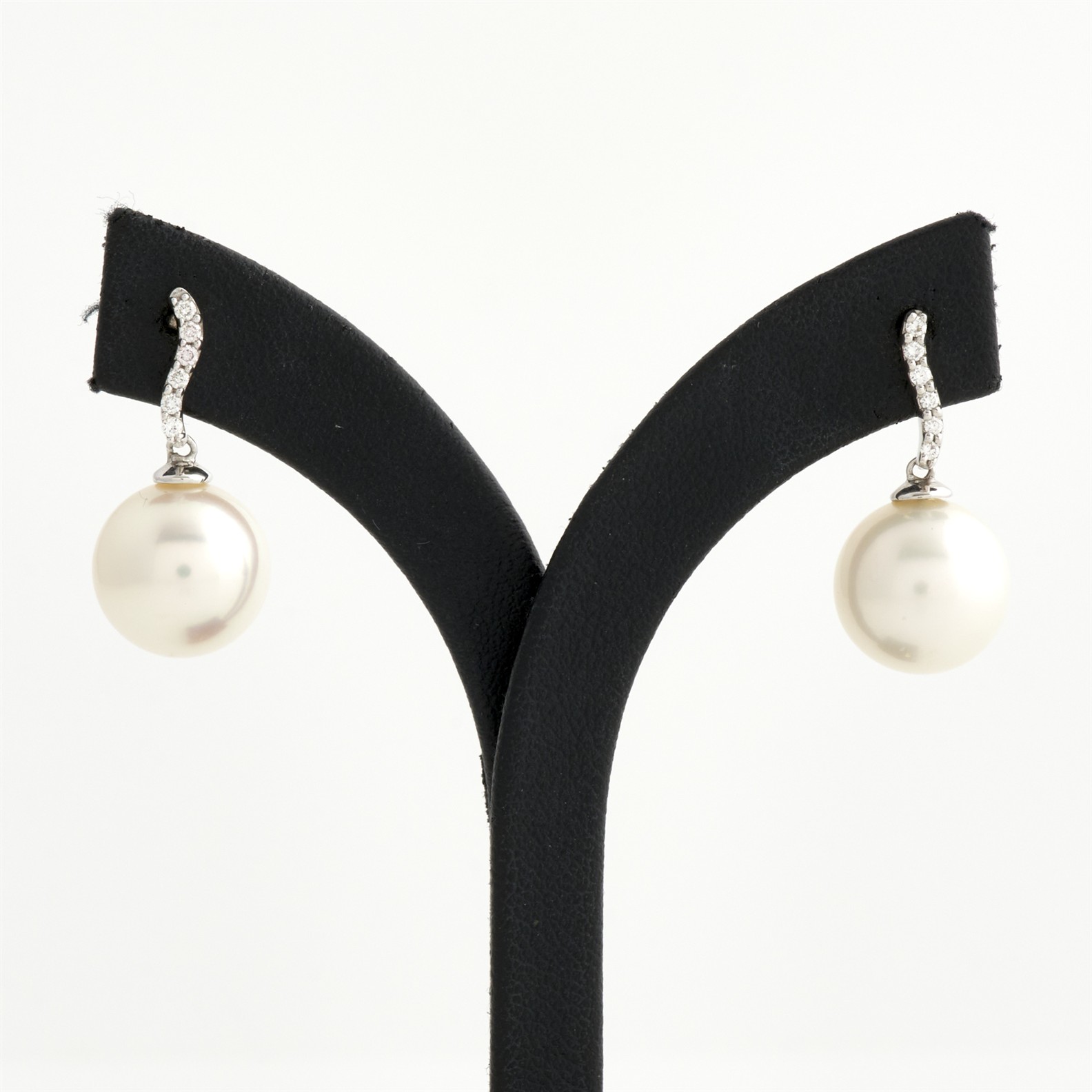 A PAIR OF SOUTH SEA PEARL AND DIAMOND EARRINGS IN 18CT WHITE GOLD, PEARL MEASURING 11.8MM, THE DIAMONDS TOTALLING APPROXIMATELY 0.11CTS, TO POST AND BUTTERFLY, 5.89GMS
