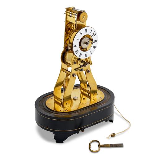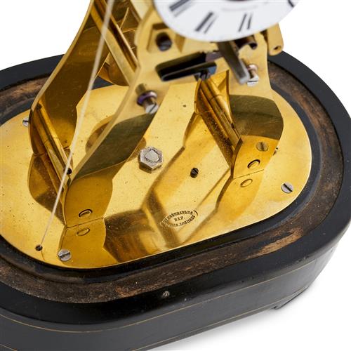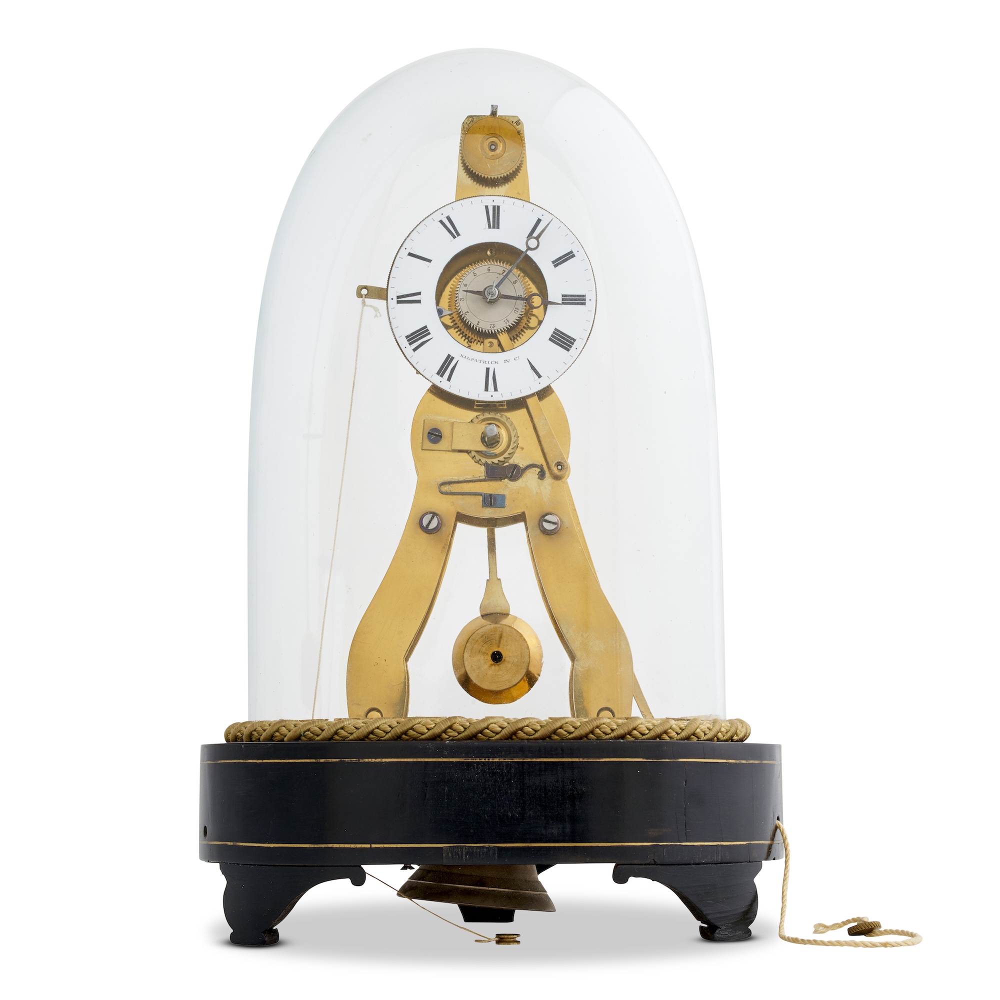 The eight-day movement with silk suspension, pull repeat, and alarm mounted with the enamelled Roman numeral dial in a simple A-frame within a glass dome on an oval ebonised wood platform base with the bell to its underside, the brass base impressed 'Ms. Honorables / Exp. / Paris . Londres'
