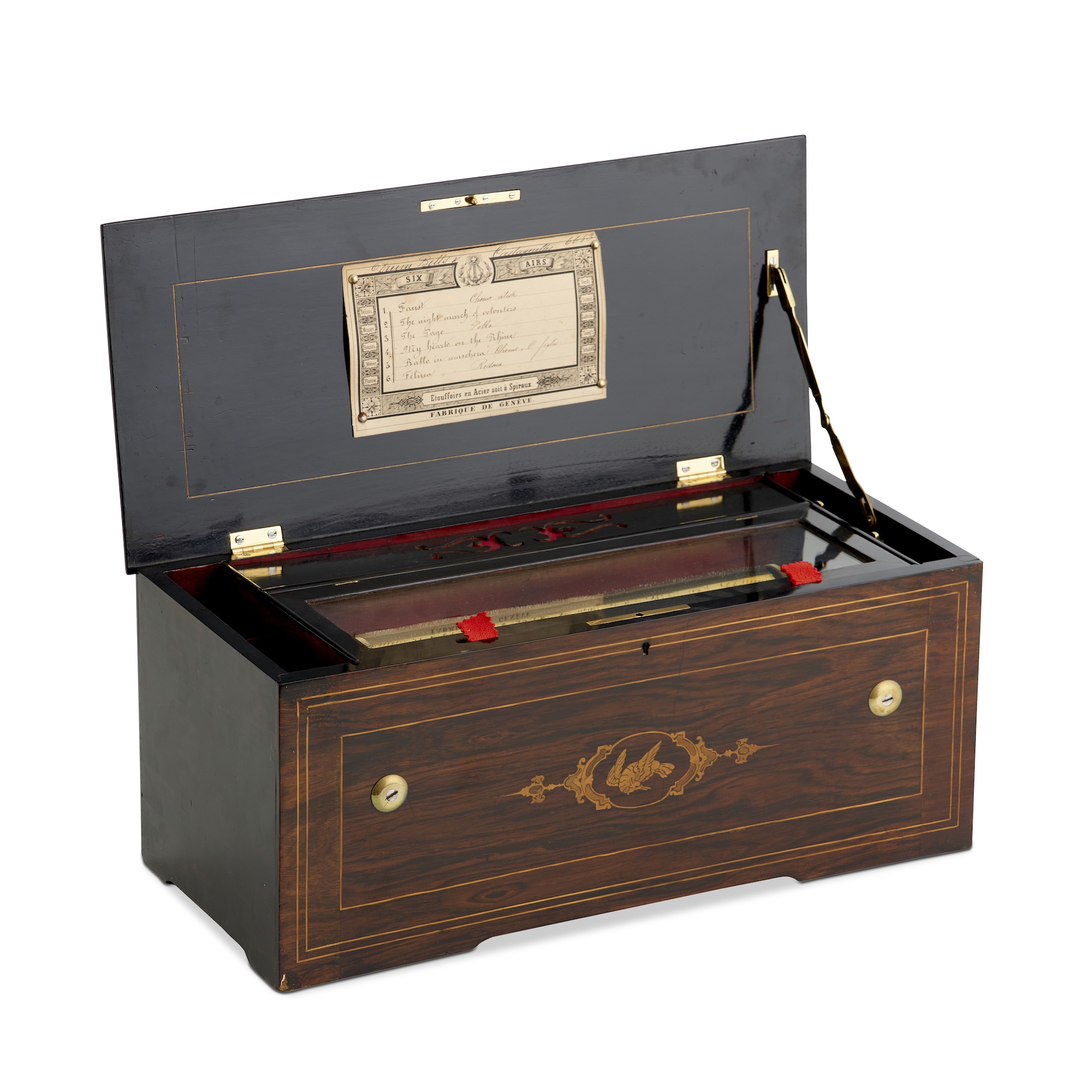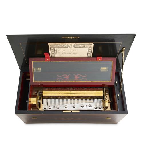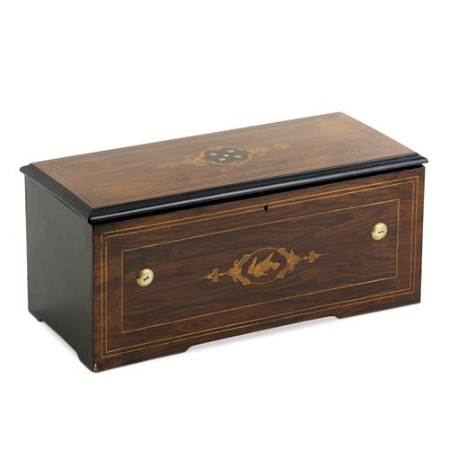 The 27cm lever-wound cylinder playing six airs, the movement with start / stop, change / repeat controls, the music box under an internal glass cover, in a rosewood and ebonised case, the top and front inlaid wih floral centres, the original tune sheet pinned to the underside of the cover