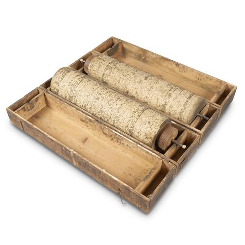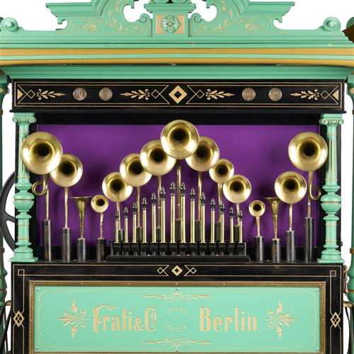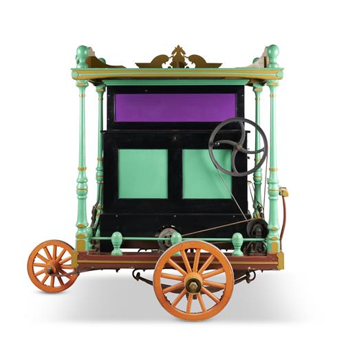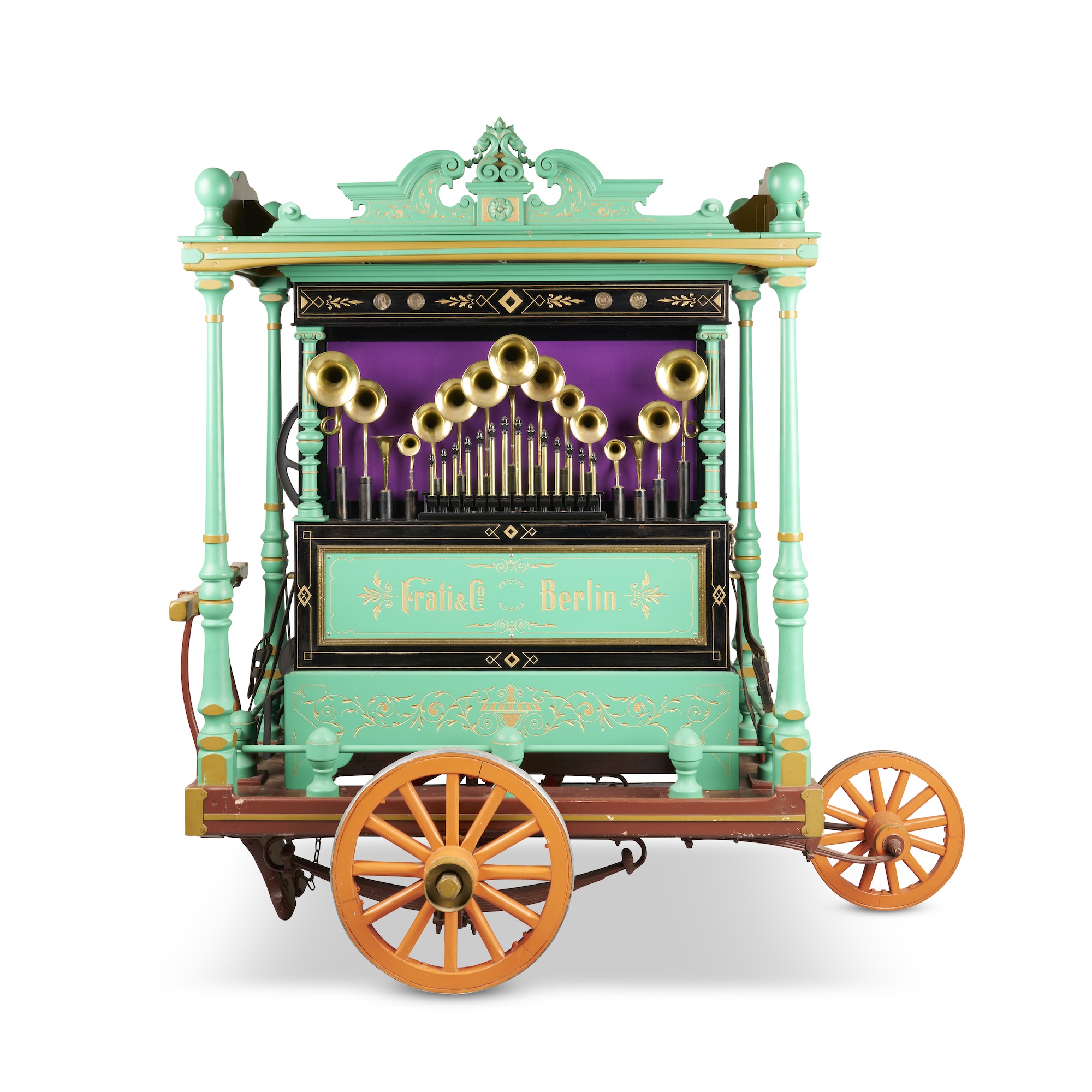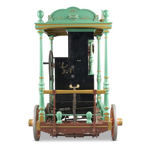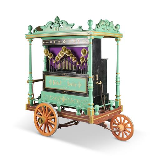 The 90cm crank-operated wooden barrel movement (later fitted with an electric motor) with fifteen brass cornets and fourteen piccolo flutes in a wooden case mounted on a tricycle platform carriage with a canopy on four posts, the case and canopy with decorative turned and carved details throughout, painted and with incised gilt details including the maker's name and the date 1884, the frieze of the case with four applied repoussé brass medallions representing prizes awarded for the organ at 1880s English and European and European exhibitions, accompanied by two additional barrels in pine crates