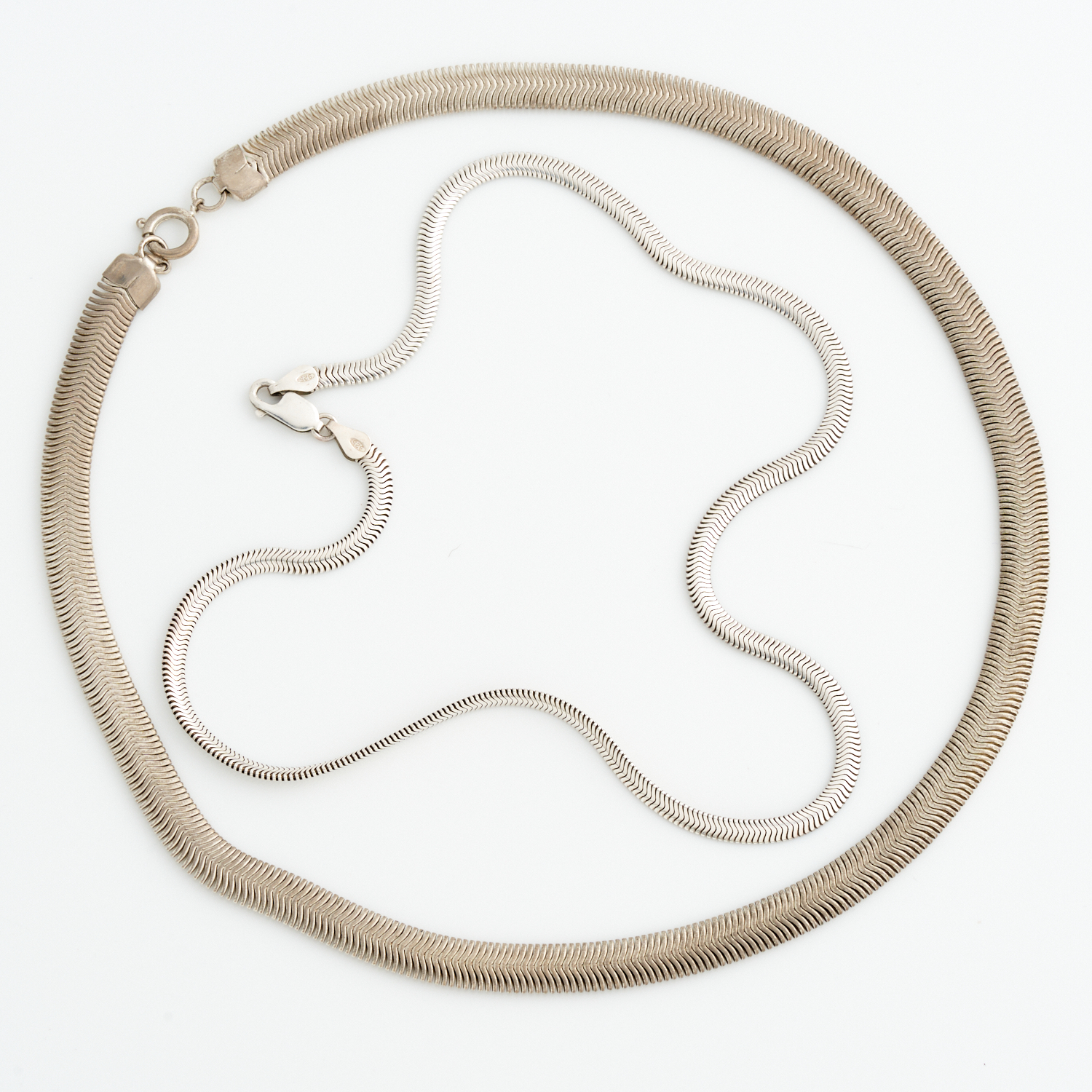 A PAIR OF SNAKE LINK CHAINS IN STERLING SILVER AND SILVER PLATE, THE LONGEST CHAIN MEASURING 440MM