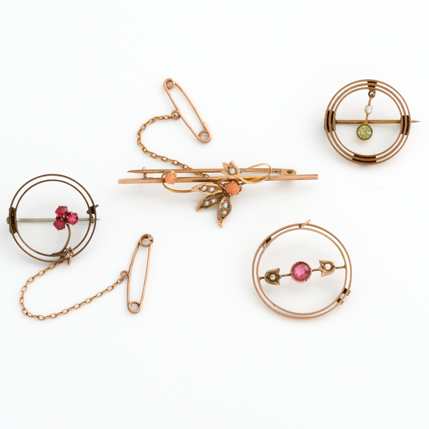 A GROUP OF FOUR VINTAGE GEM SET BROOCHES IN 9CT GOLD, THE LARGEST MEASURING 55MM, TOTAL WEIGHT 9.28GMS