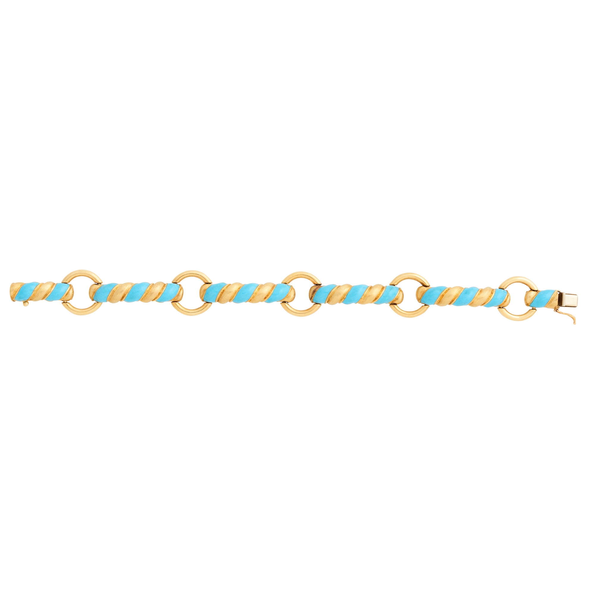 Comprising elongated links detailed with blue enamel, with alternating circular links, completed by a tongue and groove clasp, length 195mm, gross weight approximately 39.4 grams.