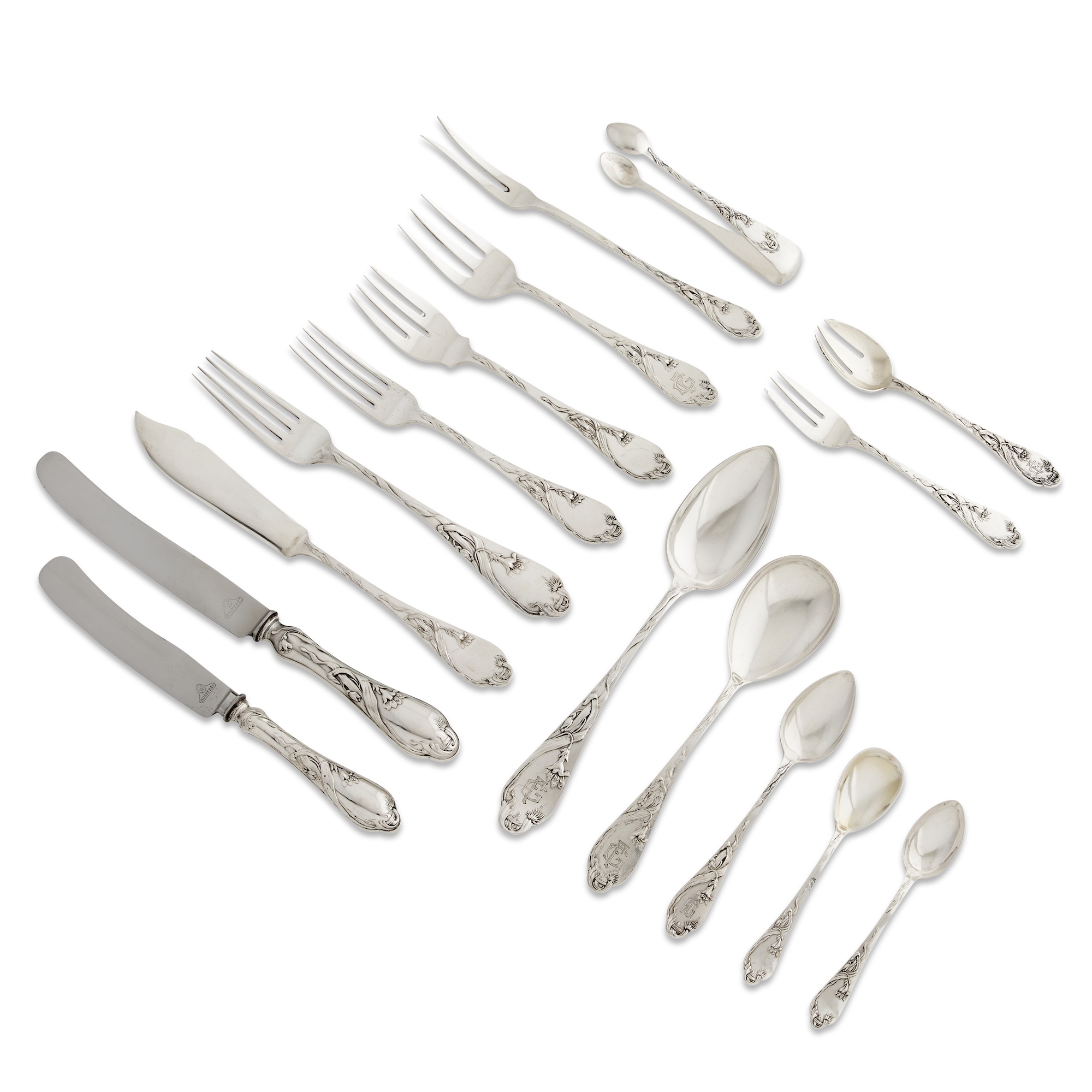 In Art Nouveau patterns, the handles and stems modelled with flowering foliage, a composite service for twelve, one hundred and thirty-eight pieces, comprising twelve each of fish knives and forks, entrée knives and forks, table knives and forks, cake forks, table spoons, and small dessert or ice cream spoons, together with eleven each of tea spoons and coffee spoons and eight various serving pieces including pairs of salad servers, oyster forks, and sugar tongs, with six of the entrée knives, table forks, and table spoons being by a different maker of the same period, these having handles of a slightly different shape and decoration, also with some variations in the shapes of the blades of the entrée knives, a few terminals engraved with initials FG in monogram